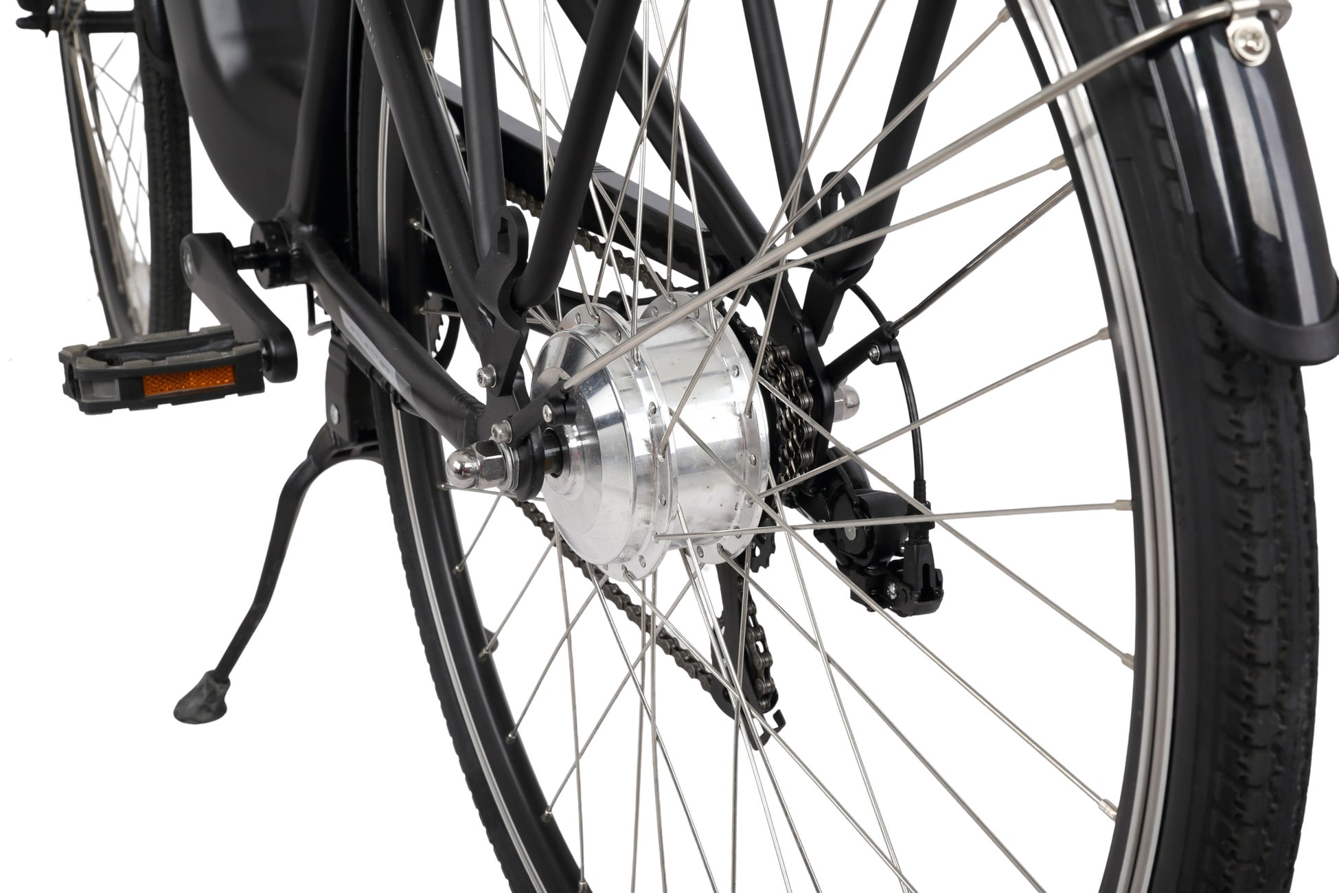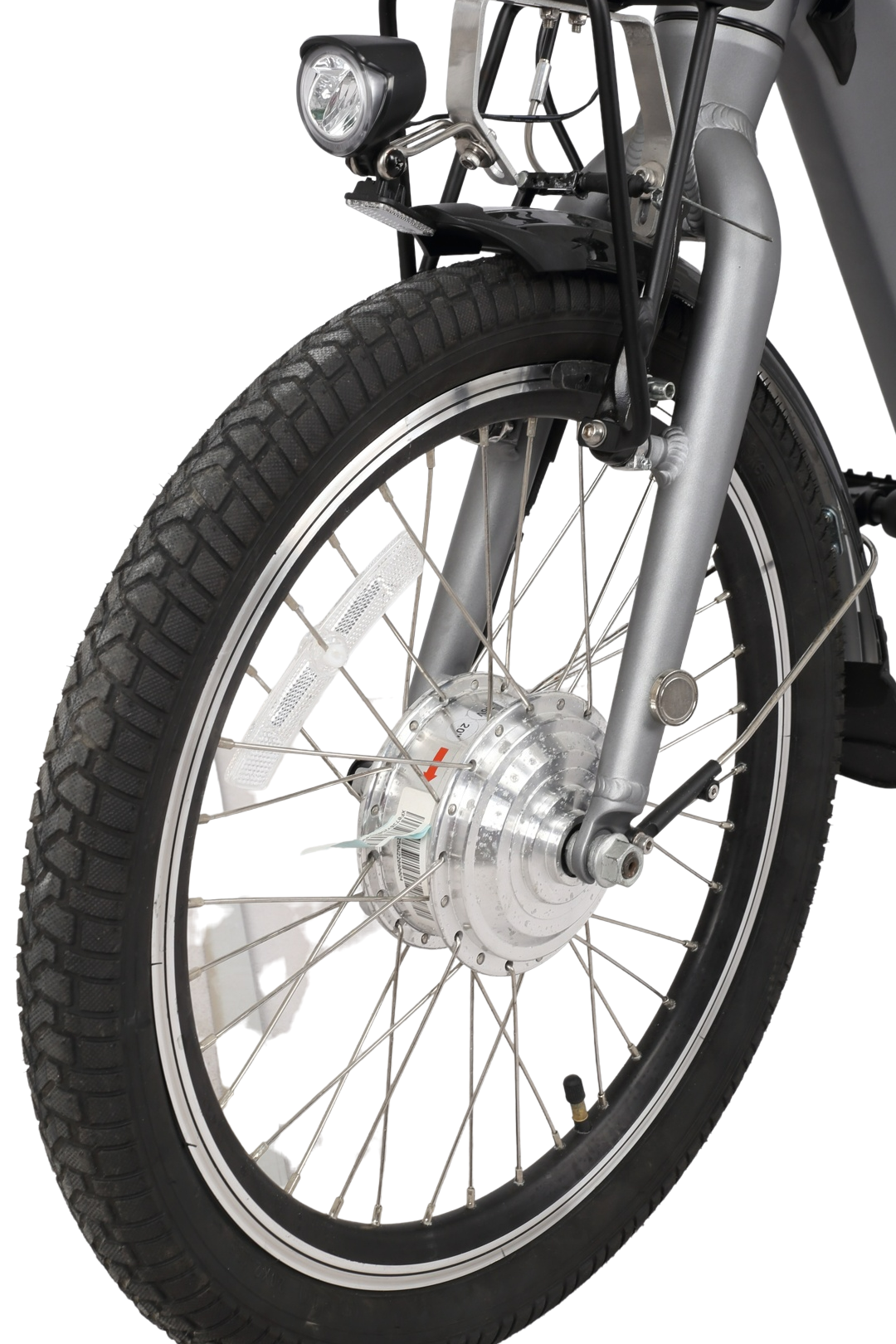 小径車の操安性を高めるためモーターはフロントに。フロントは「モーター」リアは「人力」の両輪駆動となることで操安性が高まり、タイヤの小さな小径車でも安定した走行が可能になります。変速機にはSHIMANO製NEXUS内装3段を採用しました。