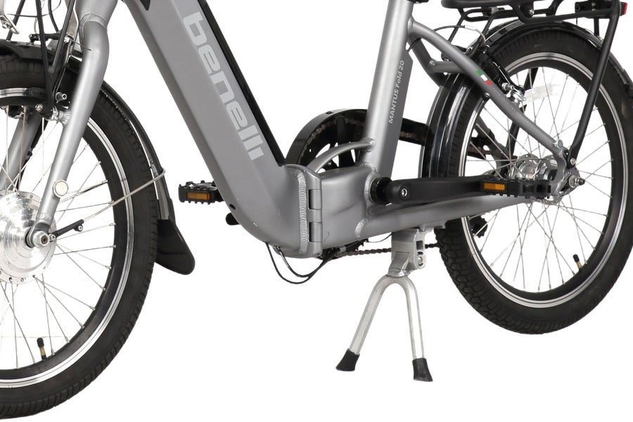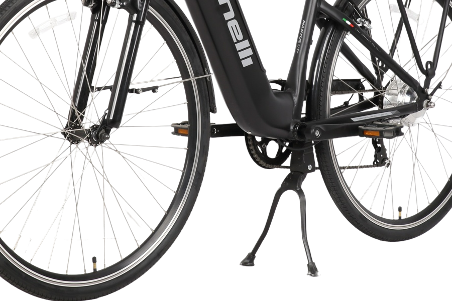 センタースタンドを採用することにより安定した駐輪が可能。スタンドはスタイリッシュなシルエットを崩さないミニマルデザイン。