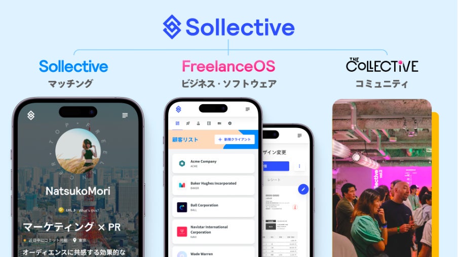 「フリーランスファースト」の理念のもと、完全審査制のハイスキルフリーランスに特化したプラットフォームを軸に、法人向けに人材サービスを展開し、フリーランス向けに自社開発のバックオフィスツールとコミュニティを提供しています。今年から他社とコラボレーションし、フリーランス向けパーティー型ネットワーキングイベント『The Collective by Sollective』を開催し、日本のフリーランスのエンパワメントにも取り組んでいます。