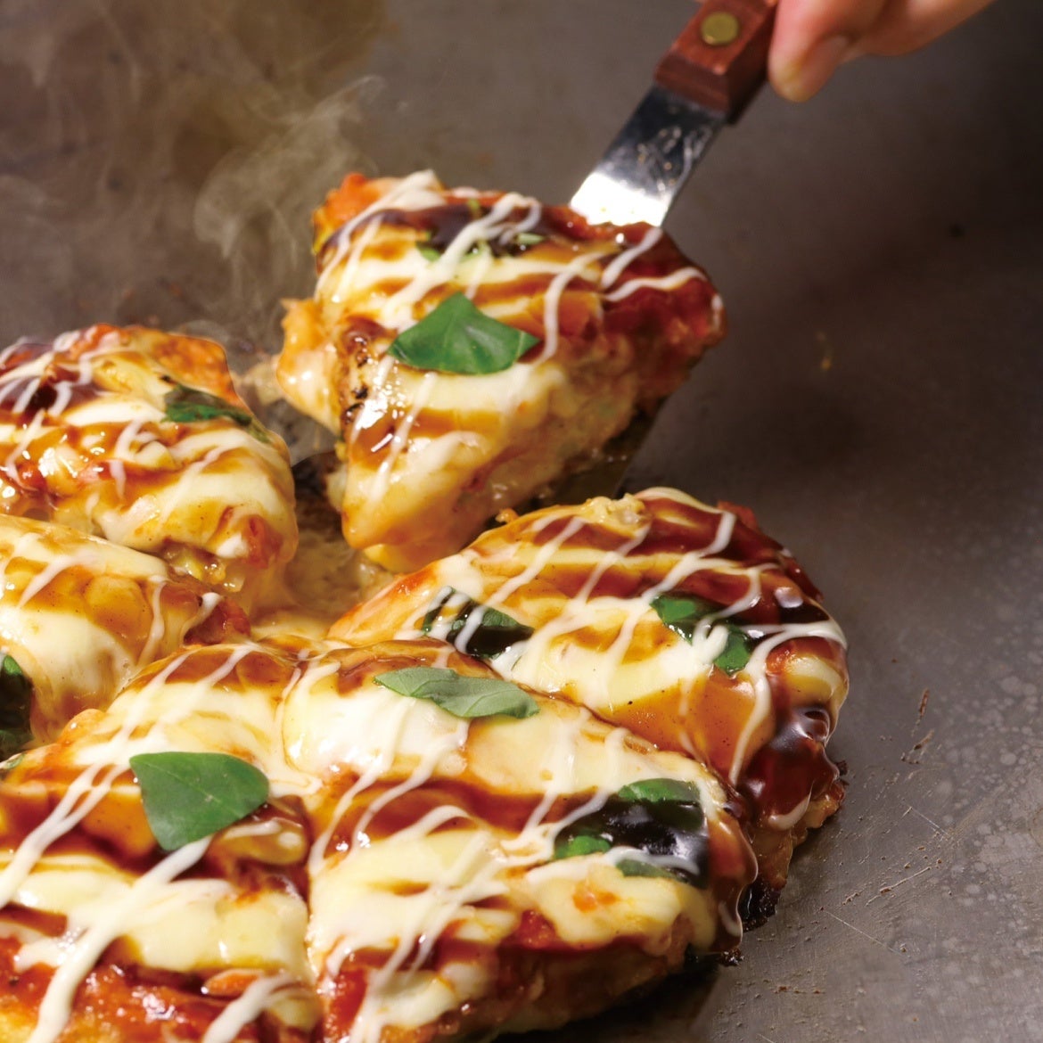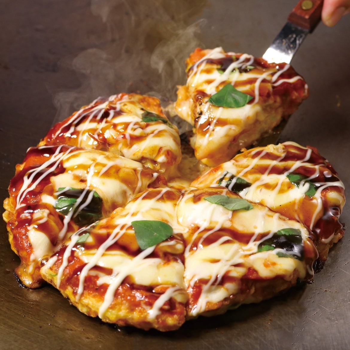 【PIZZA-LA監修】 期間限定 モッツァレラと特製トマトソース・フレッシュバジルを使った『マルゲリータ風お好み焼』を5月8日より期間限定販売