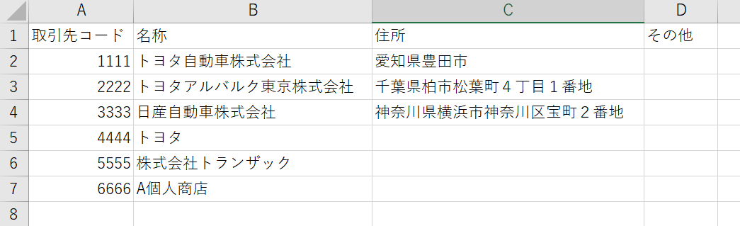絞込み画面の例(仕入先マスタに「トヨタ自動車」という不完全な名称で入力があった場合)