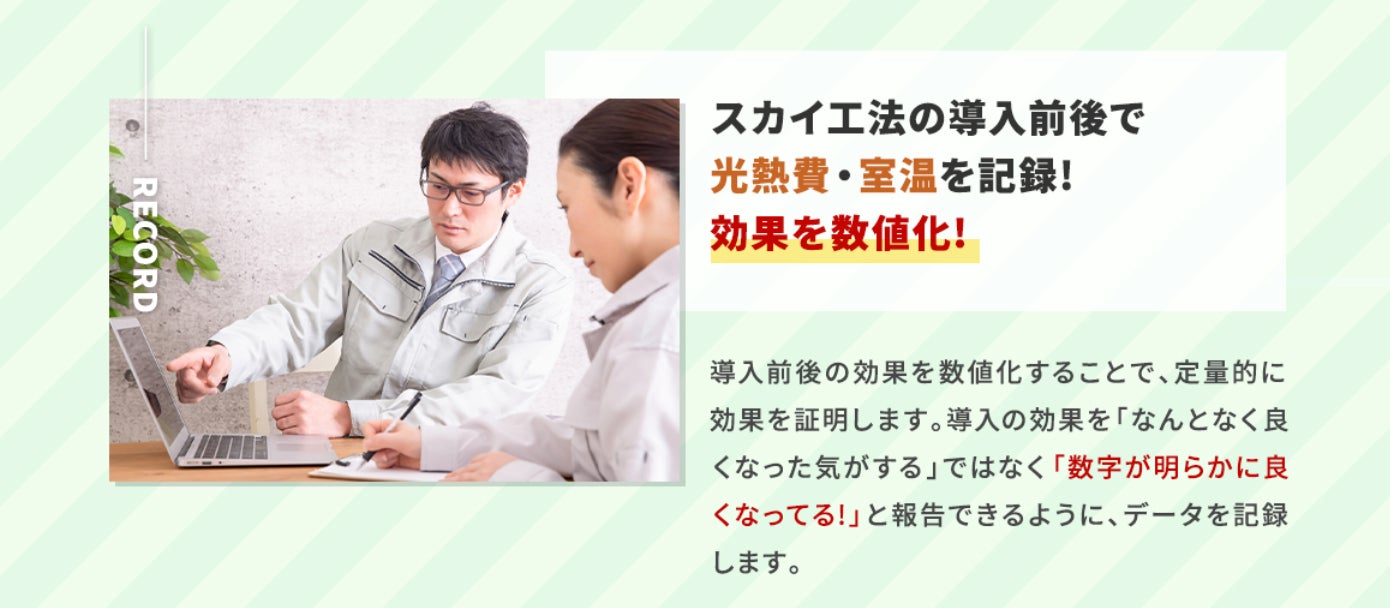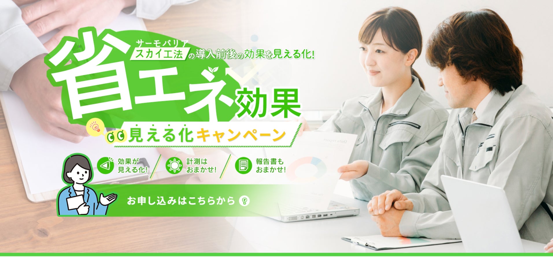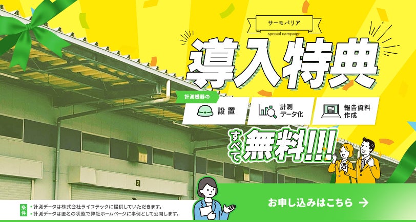 今だけ「見える化キャンペーン」の導入特典を用意しました。「サーモバリア スカイ工法」設置後の計測機器の設置、計測・データ化、報告書作成、すべて無料です。ただし以下の条件があります。