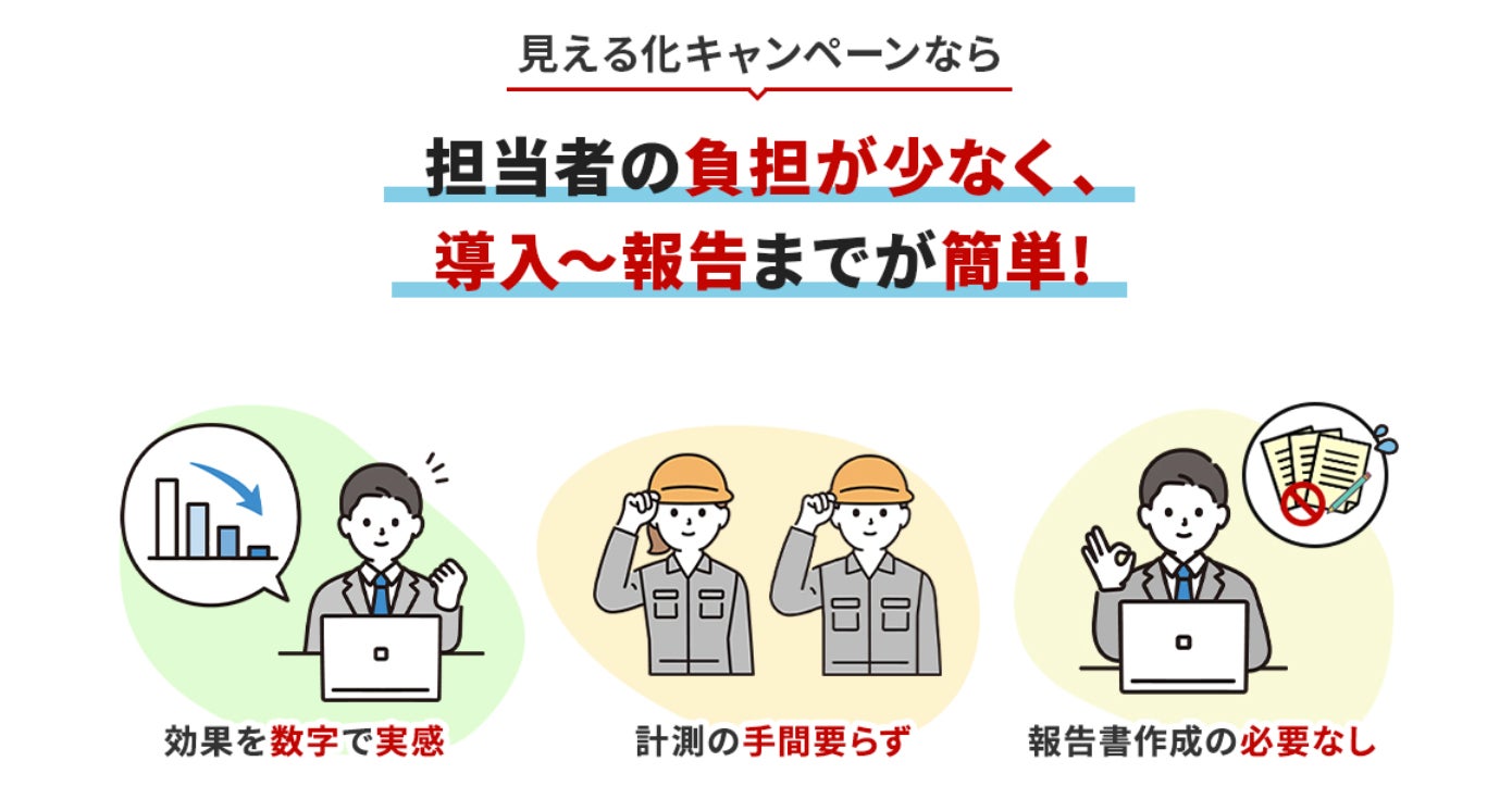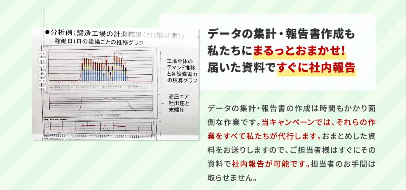 「省エネ効果見える化キャンペーン」ではこれら3つの課題を、弊社がすべて解決します。具体的には以下のとおりです。