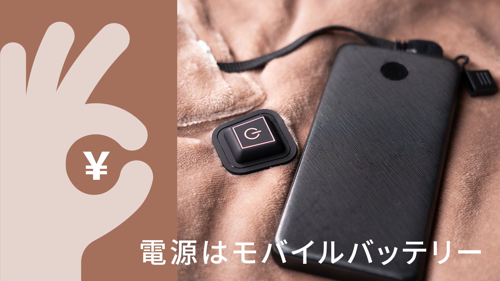 モバイルバッテリーからのUSB給電で暖かいまま⾃由に動き回ることが出来ます。