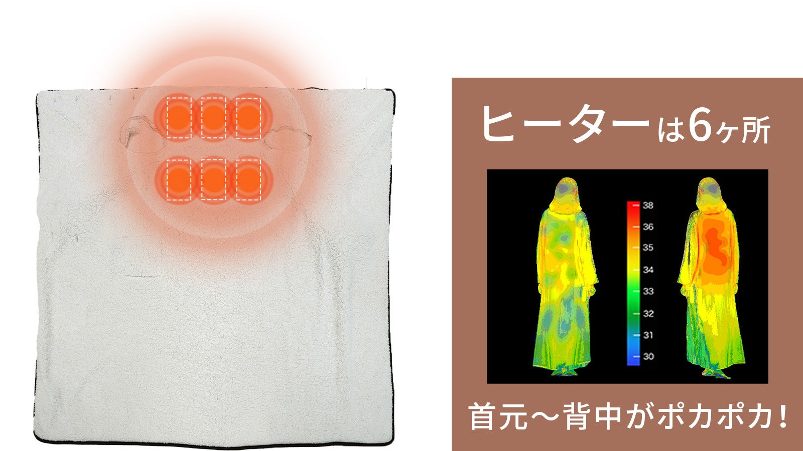 羽織った際に首元から背中にあたる部分には6つのヒーターが搭載。寒さで硬くなりがちな背中周りをポカポカ気持ちよく温めてくれます。