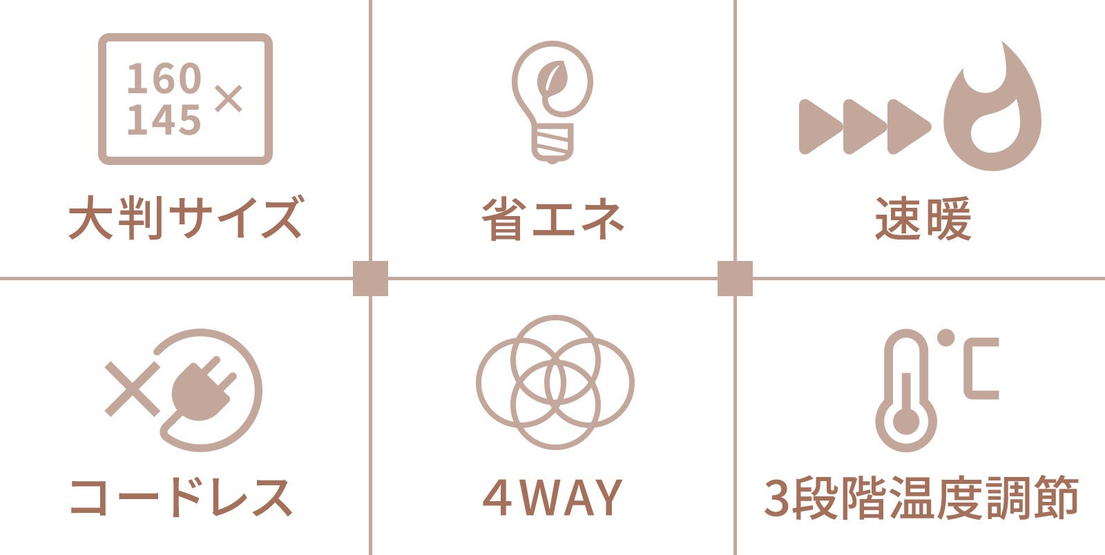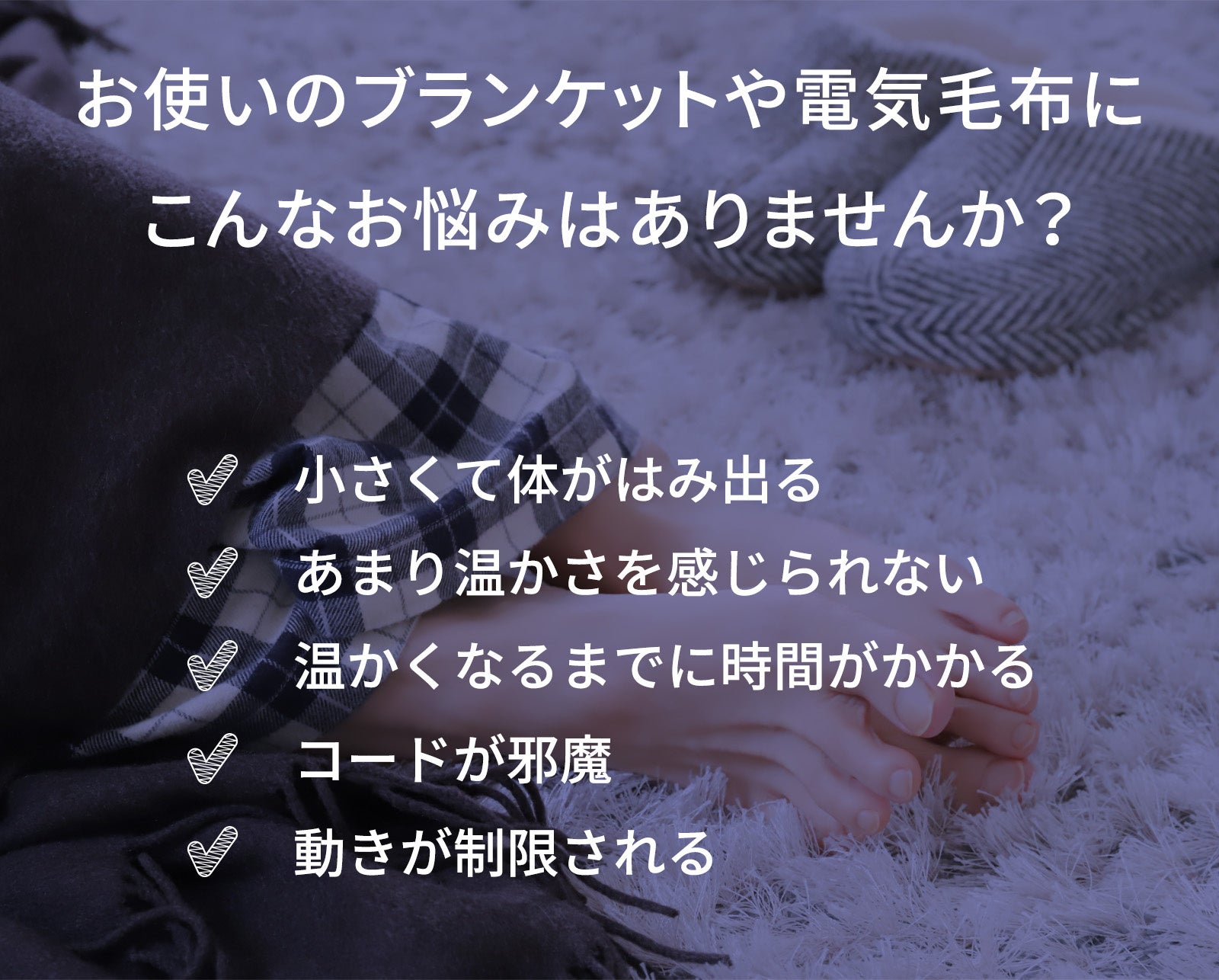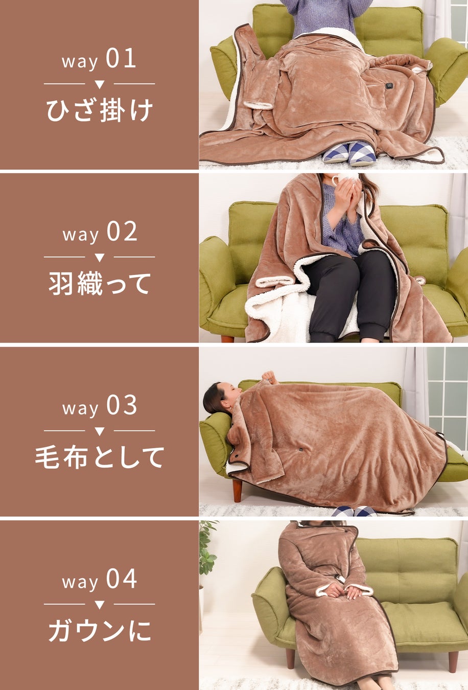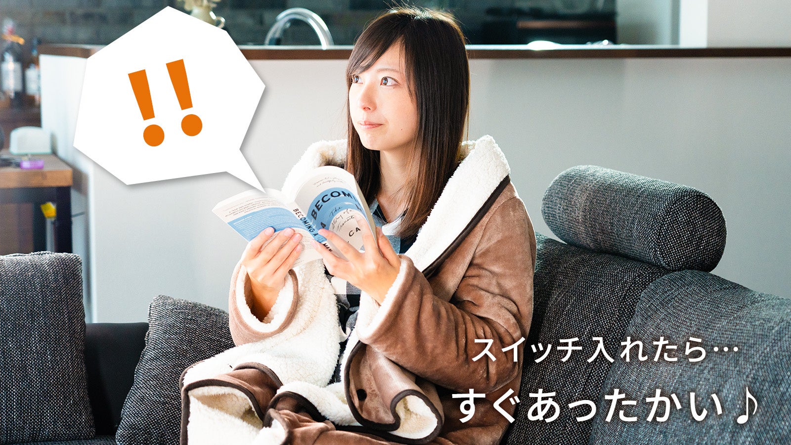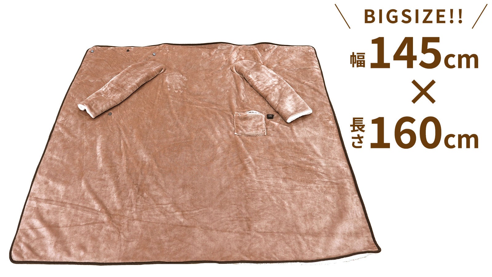ヒーター搭載の145cm×160cmの⼤判サイズブランケットなので、着ても被っても⼗分な⼤きさです。