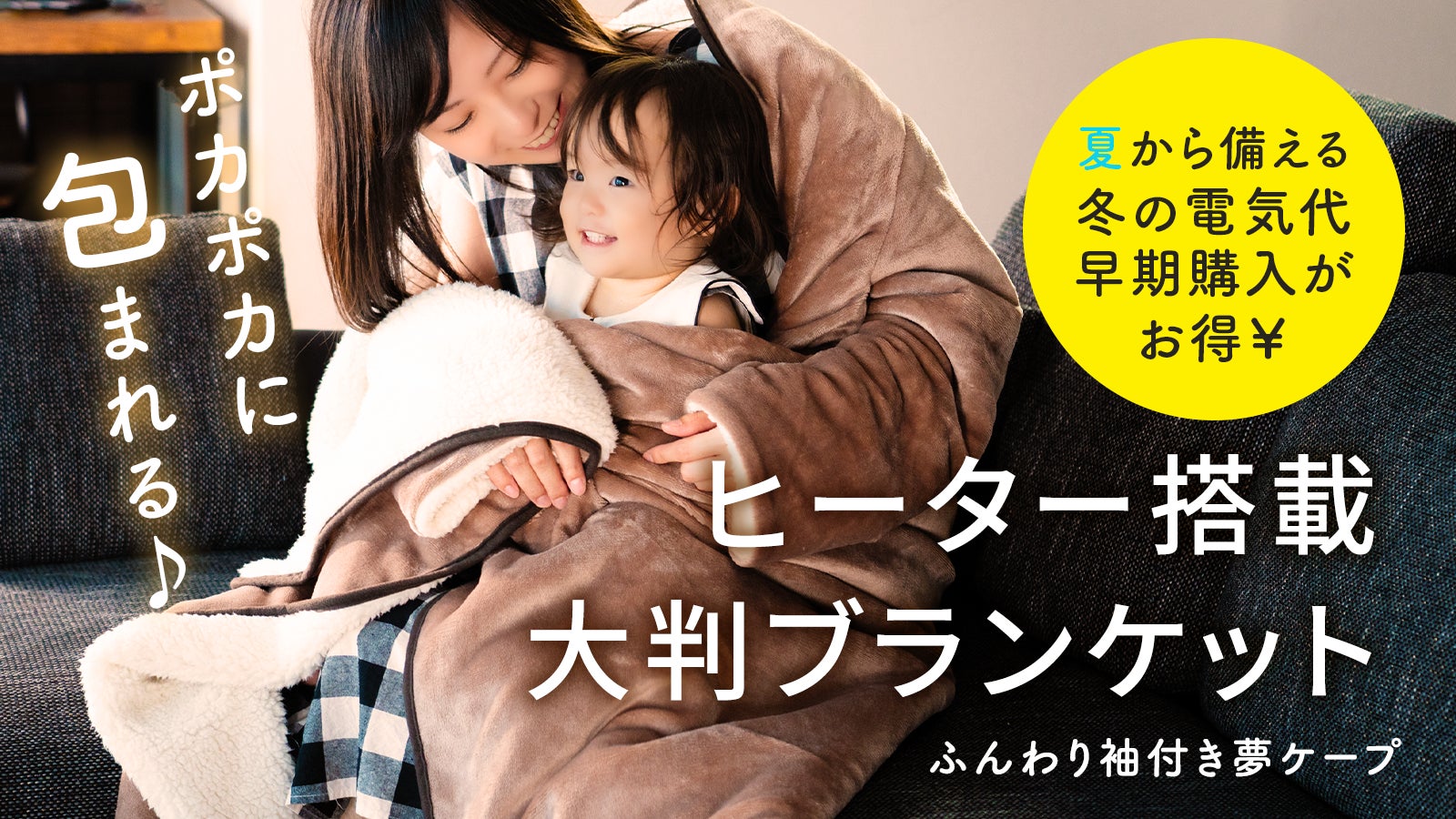 145cm×160cmの⼤判サイズブランケット『ふんわり袖付き夢ケープ』誕⽣!モバイルバッテリー給電のヒーター搭載ブランケットだから暖かいまま⾃由に動けて暖房の設定温度も抑えられる