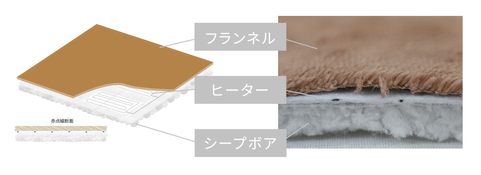 【材質】生地(表):ポリエステル100% / 生地(裏):ポリエステル100%ケーブル:ナイロン、PVC / 電源スイッチ:シリコーン / ファスナー:ナイロン、亜鉛合金 / ボタン:ポリエステル