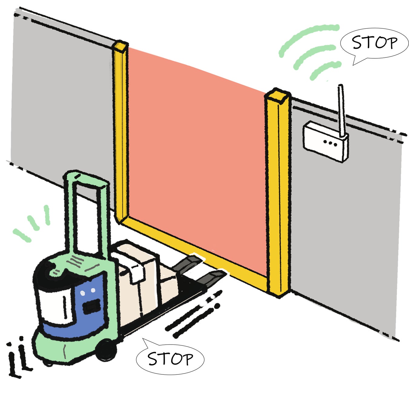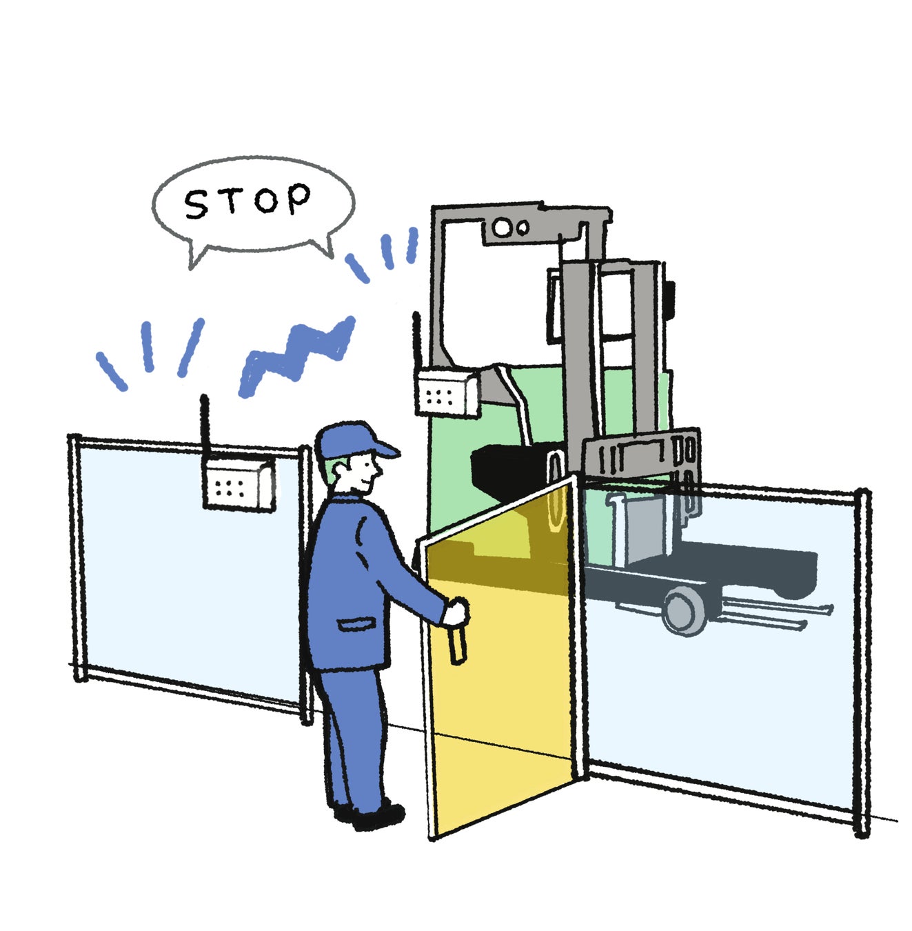 安全ドアスイッチを接点送信機に接続することで、移動車両(AGVなど)が走行する危険領域へ人が誤って侵入した場合、移動車両を無線で停止できます。