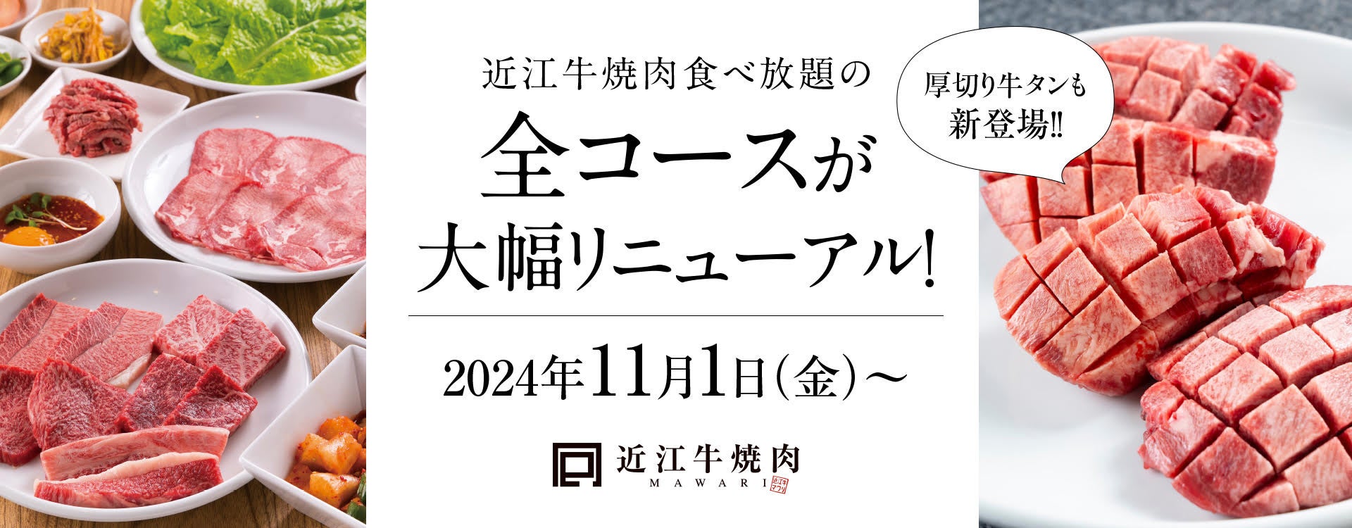 「近江牛焼肉 MAWARI」では、日頃の感謝の気持ちを込めて、全ての食べ放題コースをリニューアルし、さらに充実した内容でお客様をお迎えします。 リニューアル後の食べ放題コースでは、厳選された近江牛を存分に楽しんでいただける豪華メニューをご提供します。ご家族やご友人とのお食事はもちろん、特別な記念日など、さまざまなシーンでご利用いただけます。ぜひ、新しく生まれ変わった「近江牛焼肉 MAWARI」で、至福のひとときをお過ごしください。 今後も、最高の品質とサービスを追求し、皆様にご満足いただける店舗作りに努めてまいります。引き続きご愛顧賜りますようお願い申し上げます。