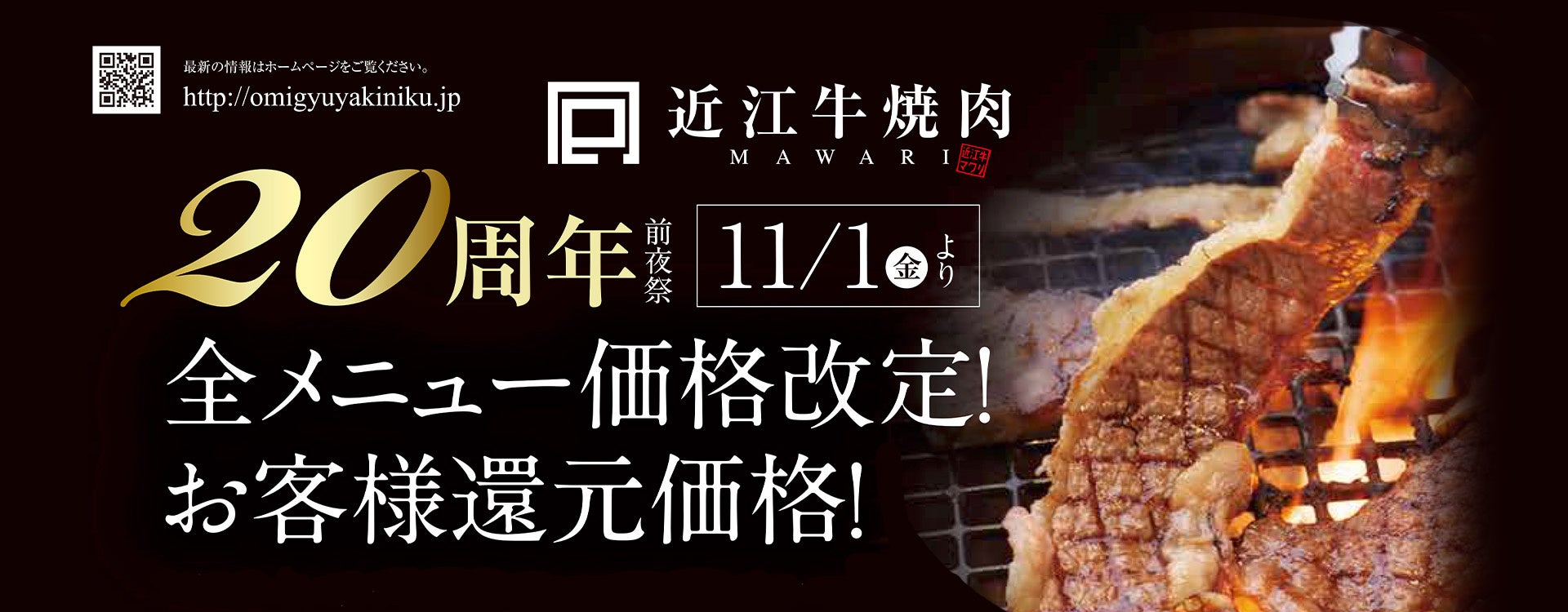 近江牛焼肉 MAWARIでは、20周年を記念して、単品メニューの価格を改定!「お客様還元価格」にてご提供いたします。【2024年11月1日(金)〜】