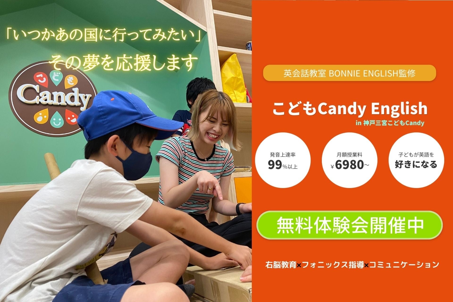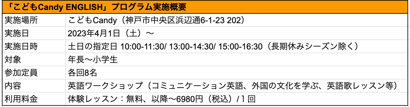 神戸の子ども起業家ラボ「こどもCandy」の運営を行う株式会社こどもCandy(代表取締役社長:手塚麻里)は、地域に貢献するための新たな取り組みとして、年長〜小学生が対象の英語コミュニケーションプログラム「こどもCandy English」を、2023年4月1日(土)から開始します。本プログラムは「ボニーイングリッシュ」監修の下、右脳教育を取り入れたコミュニケション英語や発音矯正(フォニックス指導)による伝わる英会話の習得を目指します。プログラムの詳細は以下を参照ください。