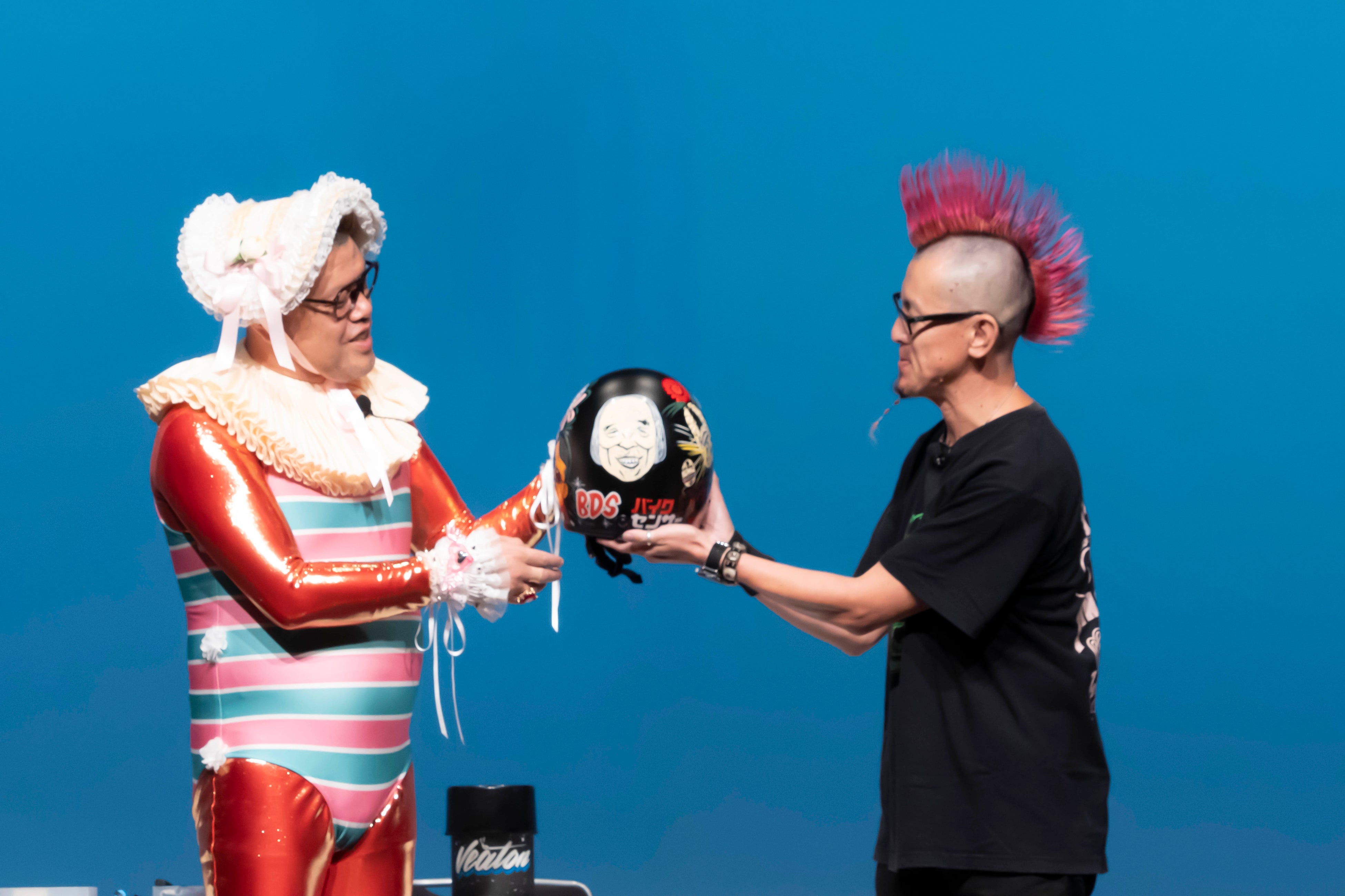 当日は新CMにご出演いただいた野性爆弾 くっきー!に登壇いただき、今回お披露目した新CMに関する撮影秘話をはじめ、バイク選びにおけるこだわりなどを語っていただきました。またイベントでは、ヘルメットのカスタムペイントにも挑戦し、アーティストとしても活動している、くっきー!ならではの独特すぎる作品が完成しました。