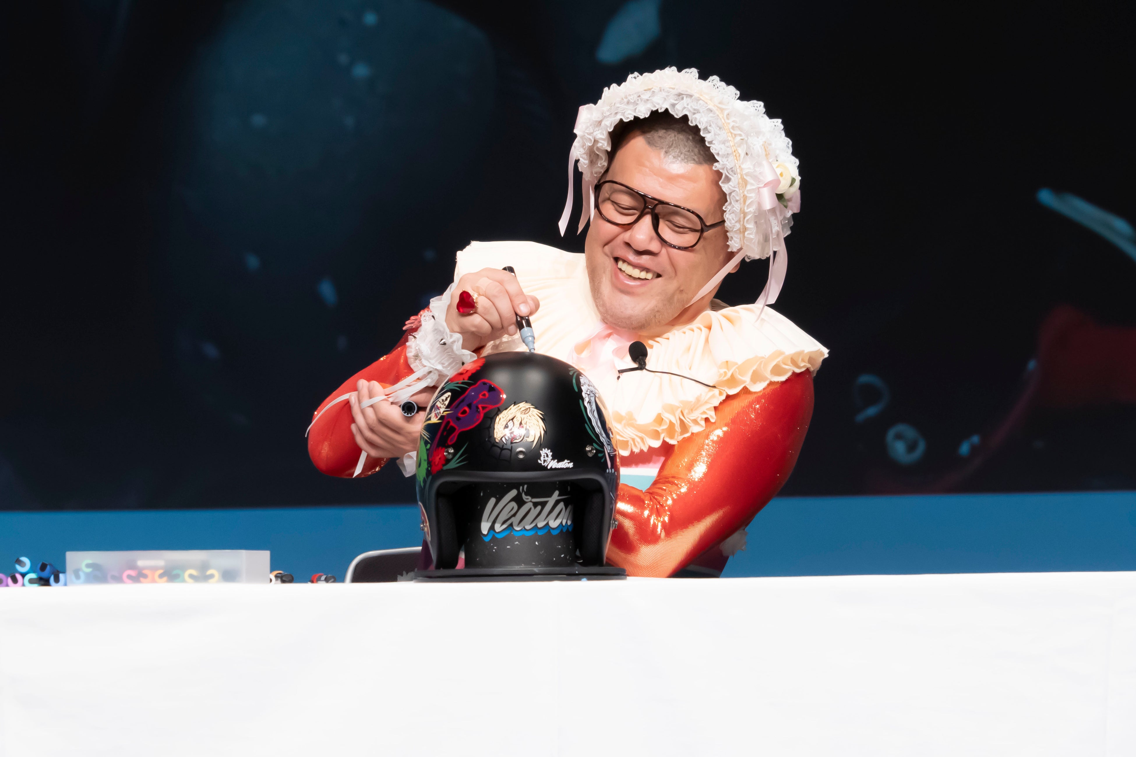 野性爆弾くっきー!がパンダの乗り物で会場に登場!! 人生初の挑戦!ヘルメットのカスタムペイントでは、くっきー!ワールド全開の結果に