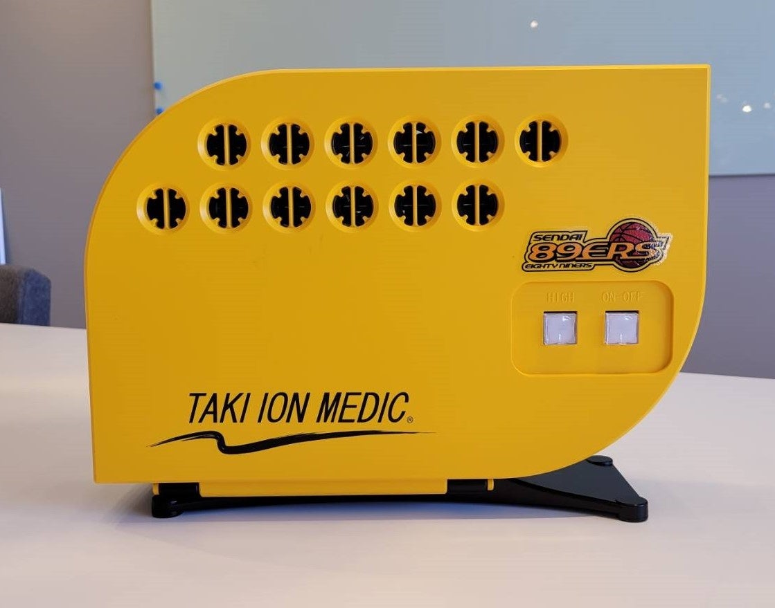 選手、関係者さまの健康づくりをサポートするべく当社製品であるマイナスイオン生成器「TAKI ION MEDIC」の提供をはじめ、同チームの本拠地「ゼビオアリーナ仙台」への設置など、観戦される皆さまにもご安心いただける環境づくりをお手伝いしております。