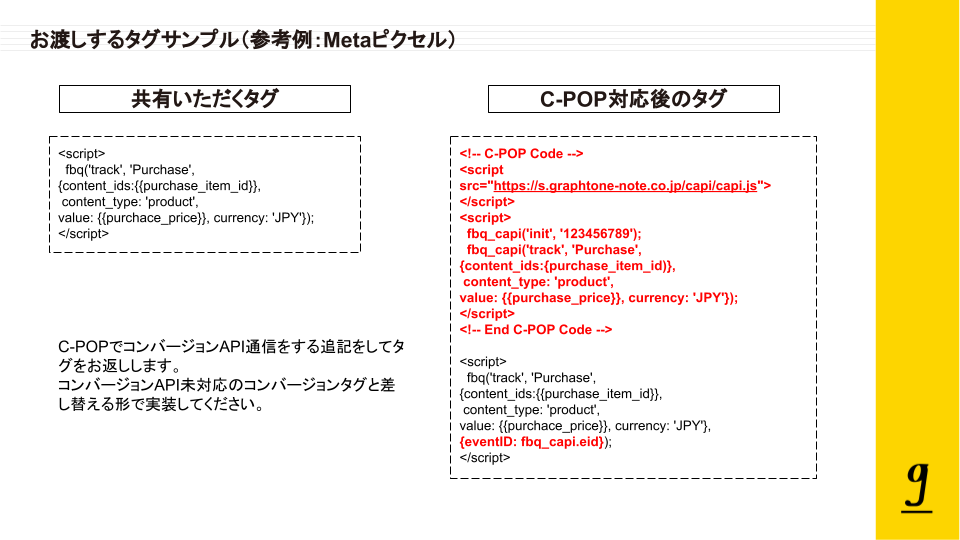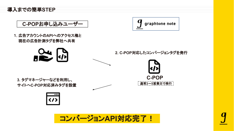 C-POPは当社で開発したタグを利用することで、コンバージョンAPIの導入を簡単かつ安価に実現します。