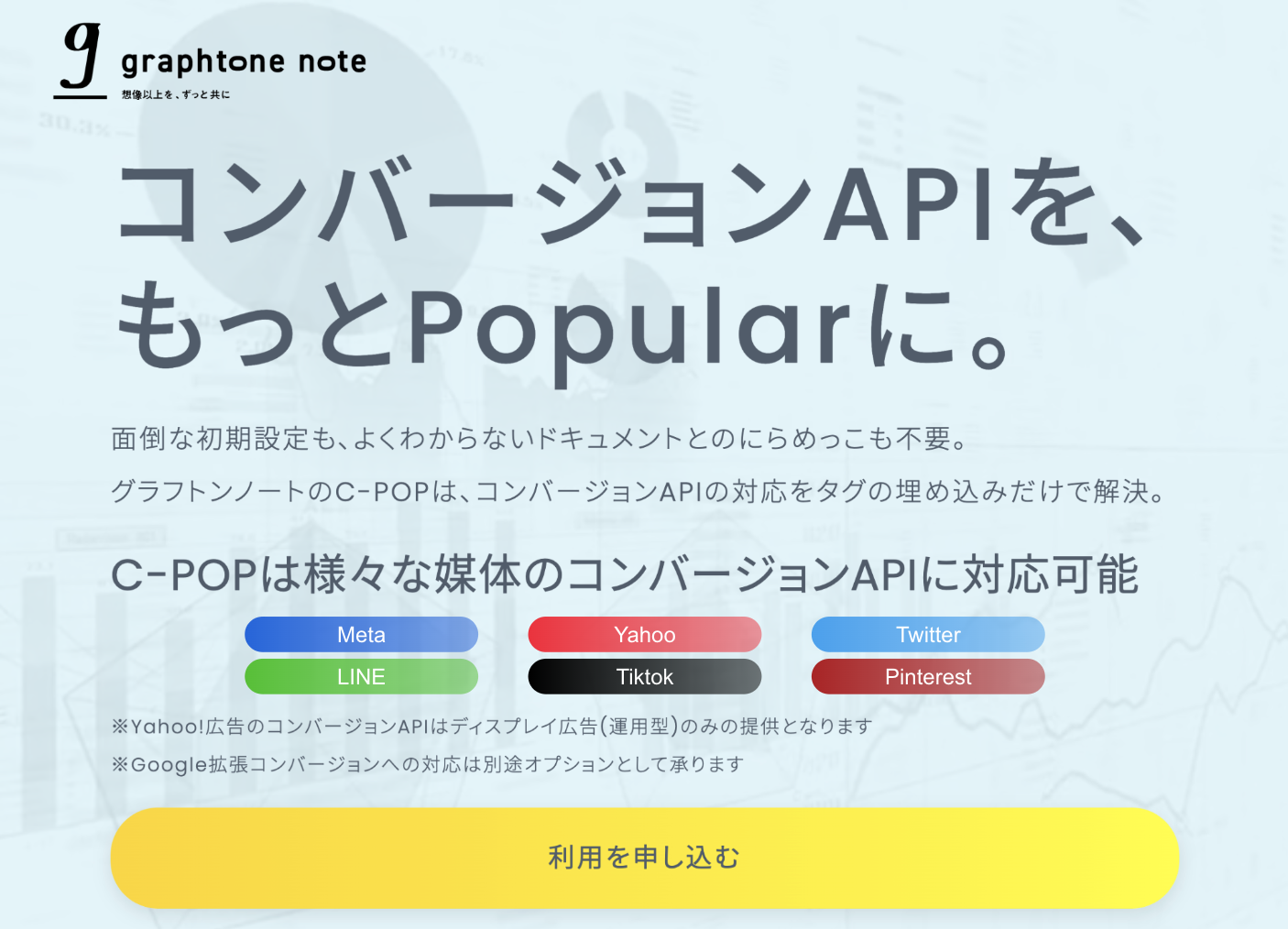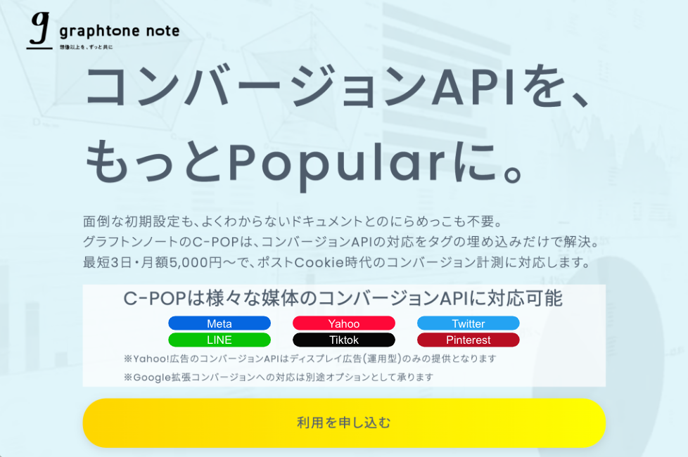 簡単かつ安価なコンバージョンAPI対応ツール「C-POP」が、新たにYahoo!ディスプレイ広告、LINE広告、TikTok広告、Pinterest広告のコンバージョンAPIに対応