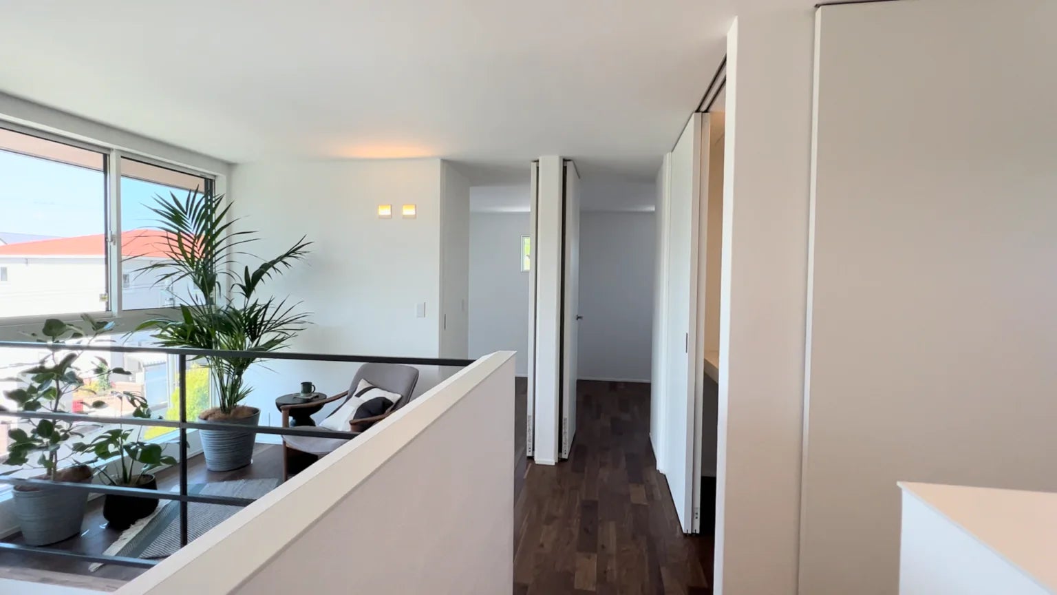 漆喰の壁や、ウォルナット天然木の床材を採用したモダンで上質なインテリア空間は見応え抜群。また、選び抜かれた照明や、洗面を装飾するタイルなど、多くのお家づくりに携わってきた私たちのこだわりを詰め込みました。家づくりを考え始めた方に、インテリアデザインのヒントを見つけてもらえるような建物になりました。