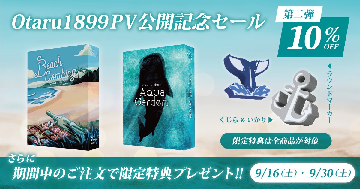 うちばこやでは、最新作ボードゲーム『Otaru 1899』の発売に際し、セール第一弾、セール第二弾を開催中です。さらに、本日9月16日から9月30日までの間に公式オンラインストアでご注文いただくと、最人気のアクアガーデンシリーズで使用できるイカリ・くじらのラウンドマーカーが特典として付属します。セール対象商品のご注文に限らず、どの商品をご注文いただいても、1回の注文あたり1セット(合計2個)が付属します。お得なこの機会に、ぜひまとめてお買い求めください。