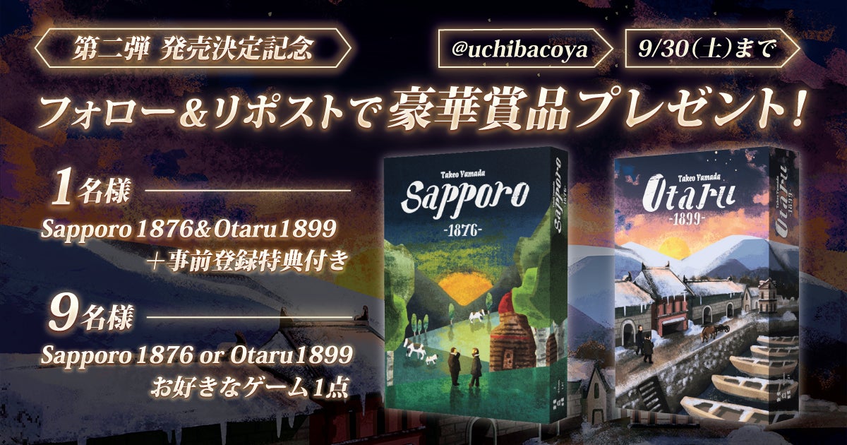 本日より、最新作『Otaru1899』と、合わせて遊べる『Sapporo1876』が10名様に当たるXキャンペーン第二弾を公式X(@uchibacoya)上で開催いたします。