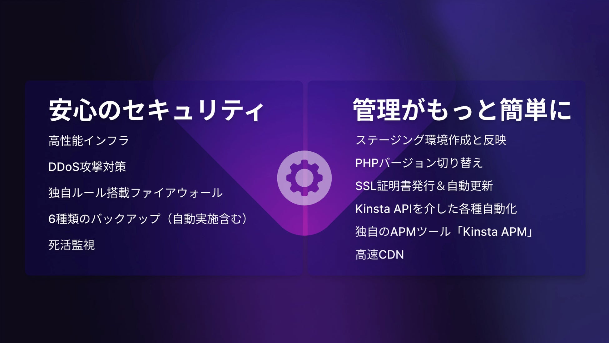 Kinstaは、数々の便利な機能と最先端技術、高性能インフラストラクチャを提供しています。堅牢なセキュリティ強化策によりDDoS攻撃などの脅威に備えます。さらに日々の開発やメンテナンスが捗るステージング環境作成機能をデフォルトで搭載。