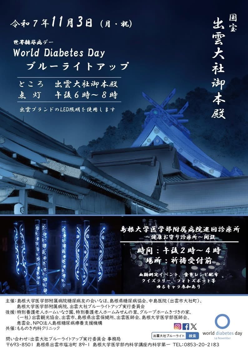 【11/3(月・祝)】第11回目の開催を記念して出雲大社で健康お守り診療所「1日診療所」を開設。◎出雲大社ブルーライトアップ◎World Diabetes Day(世界糖尿病デー)