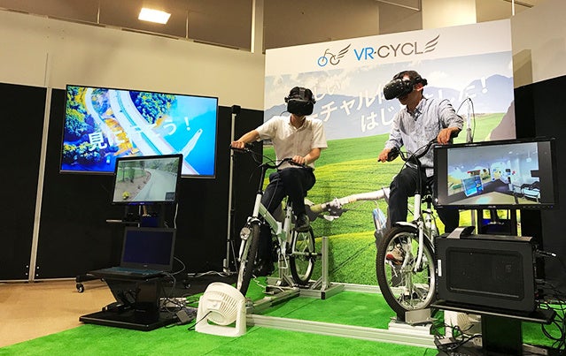 展示会場:神戸・東京会場にて展示サイクリングVRは、自転車(エアロバイク)とVRを組み合わせたスピード連動型の360VR映像再生システムです。ペダルを漕ぐスピードに合わせて、360VR映像のスピードも変化するため、あたかも実際に現地を走っているかのような体験が味わえます。各種イベント催事での利用はもちろん、安全な乗り物ですので、観光地PRに是非ご活用ください。