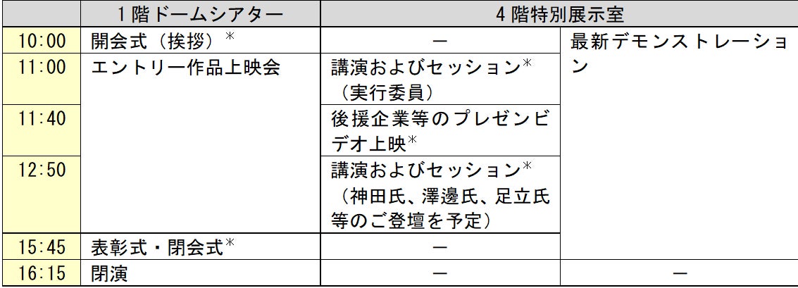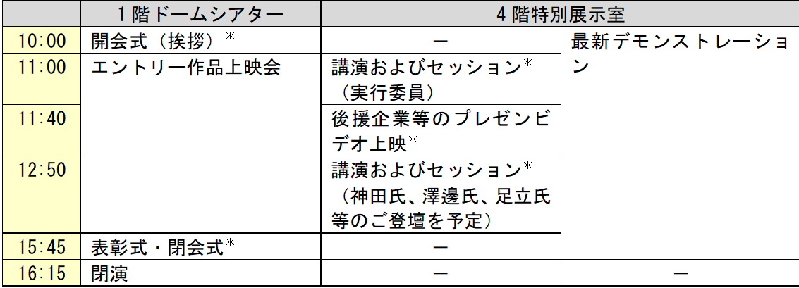 上記表中の*をスクリーン上映すると共に、一部エントリーVR作品をVRゴーグルにて体験いただく予定です。後援企業による最新デモンストレーションは会場の都合により、一部設置となります(詳細は後述いたしております。ご確認ください)。