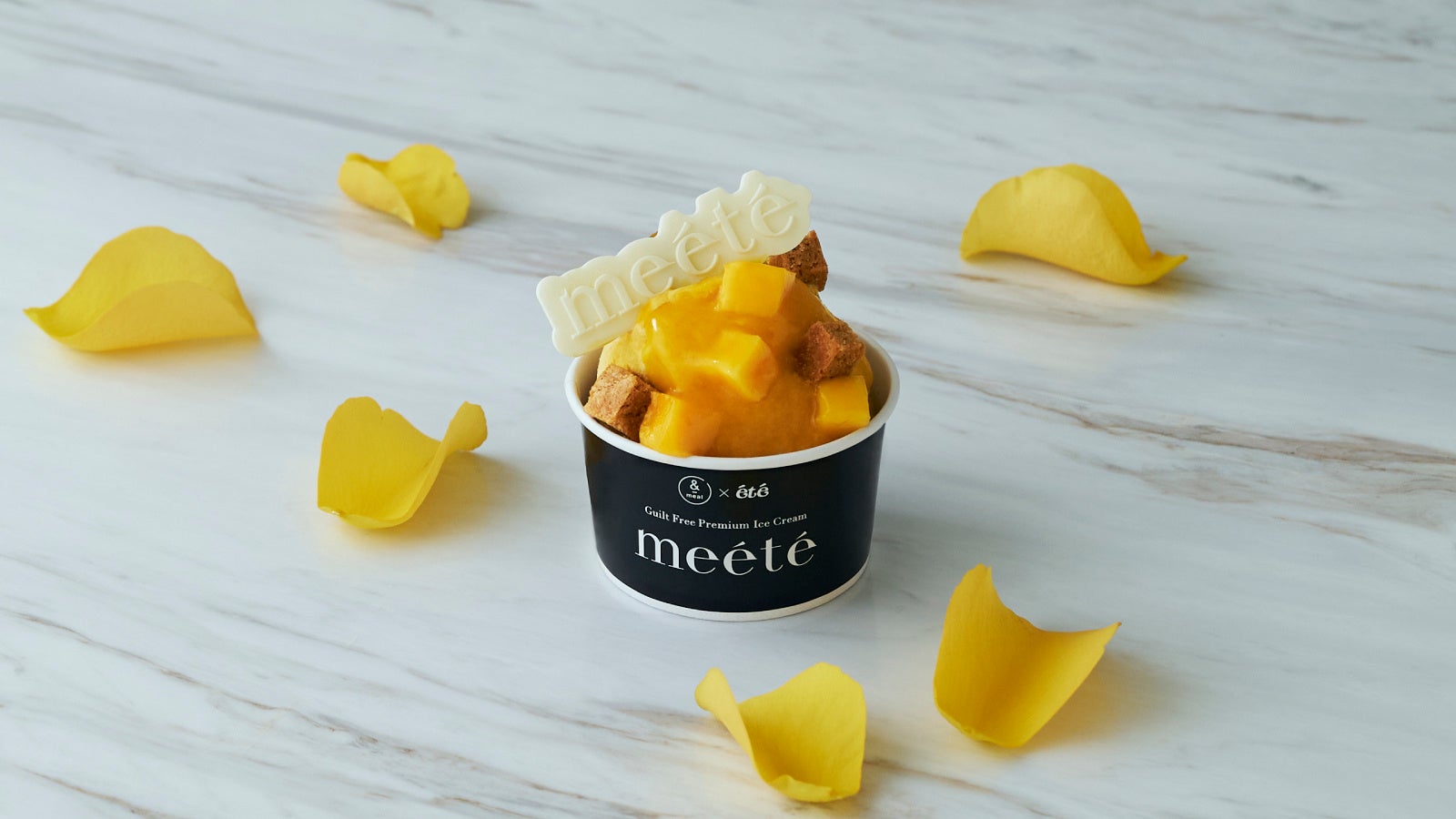 meété ギルトフリープレミアムアイスクリームの誕生を記念して、発売より一足先にお召し上がりいただける1日限定イベントを開催。当日は、étéのオーナーシェフ庄司夏子氏がイベント会場に立ち、イベント限定の「マンゴー杏仁」をパフェのように仕立てたスペシャルメニューを振る舞います。(トップの写真参照)