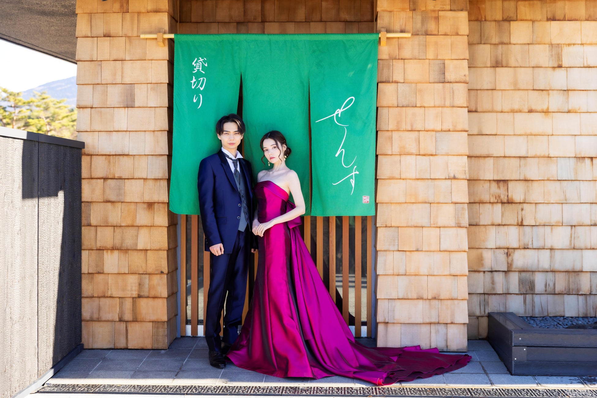 四季折々に姿を変える富士山の神秘的な美しさ。本サービスでは、お二人のためにその富士山を望む庭園を貸し切りにした撮影を行います。そのほか、どの場所からも富士山を感じることができるよう設計されているラグジュアリーなスイートヴィラ内やテラス、温浴棟など、施設内のさまざまなスポットで撮影が可能です。