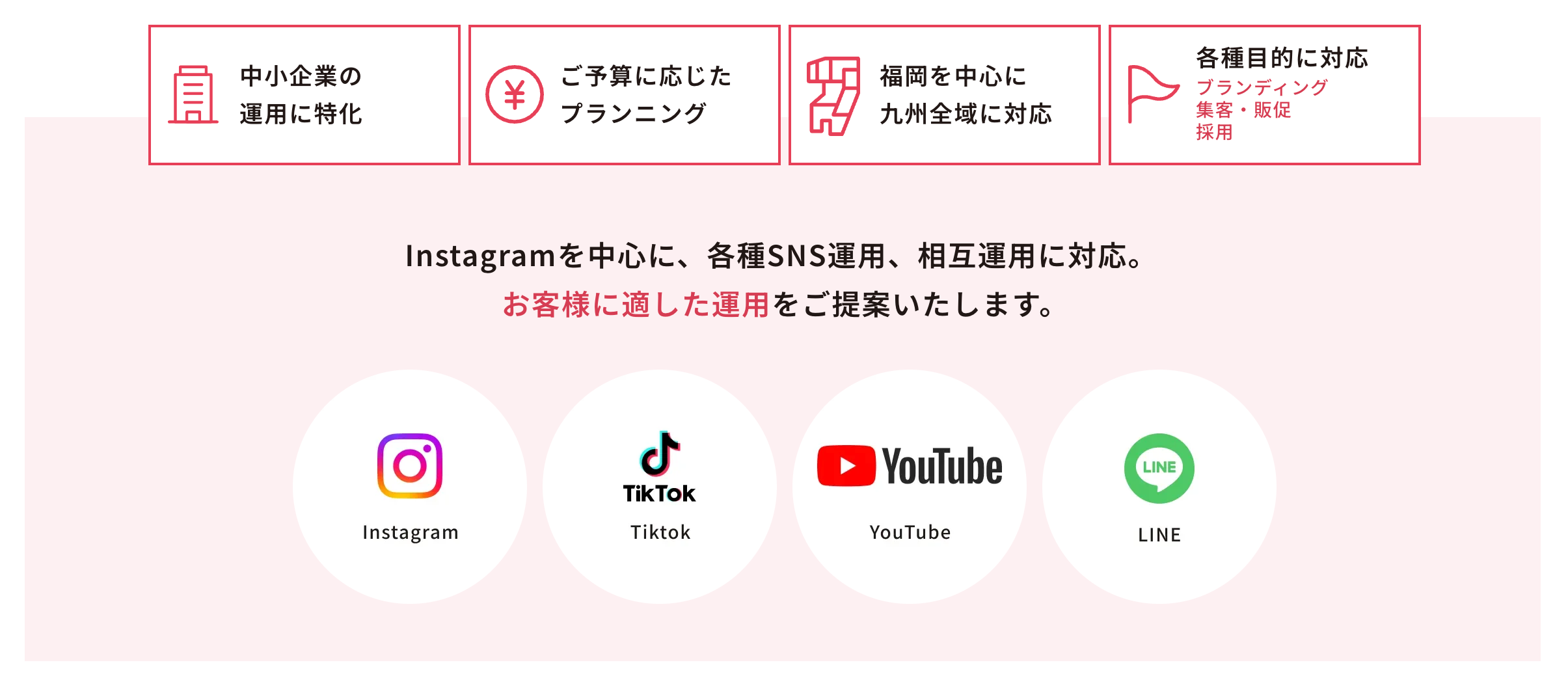 SNSを活用したマーケティングの戦略立案から運用の実行支援やコンサルティングを提供し、貴社の認知獲得、拡大から集客、採用獲得までをサポートするSNSマーケティング会社です。