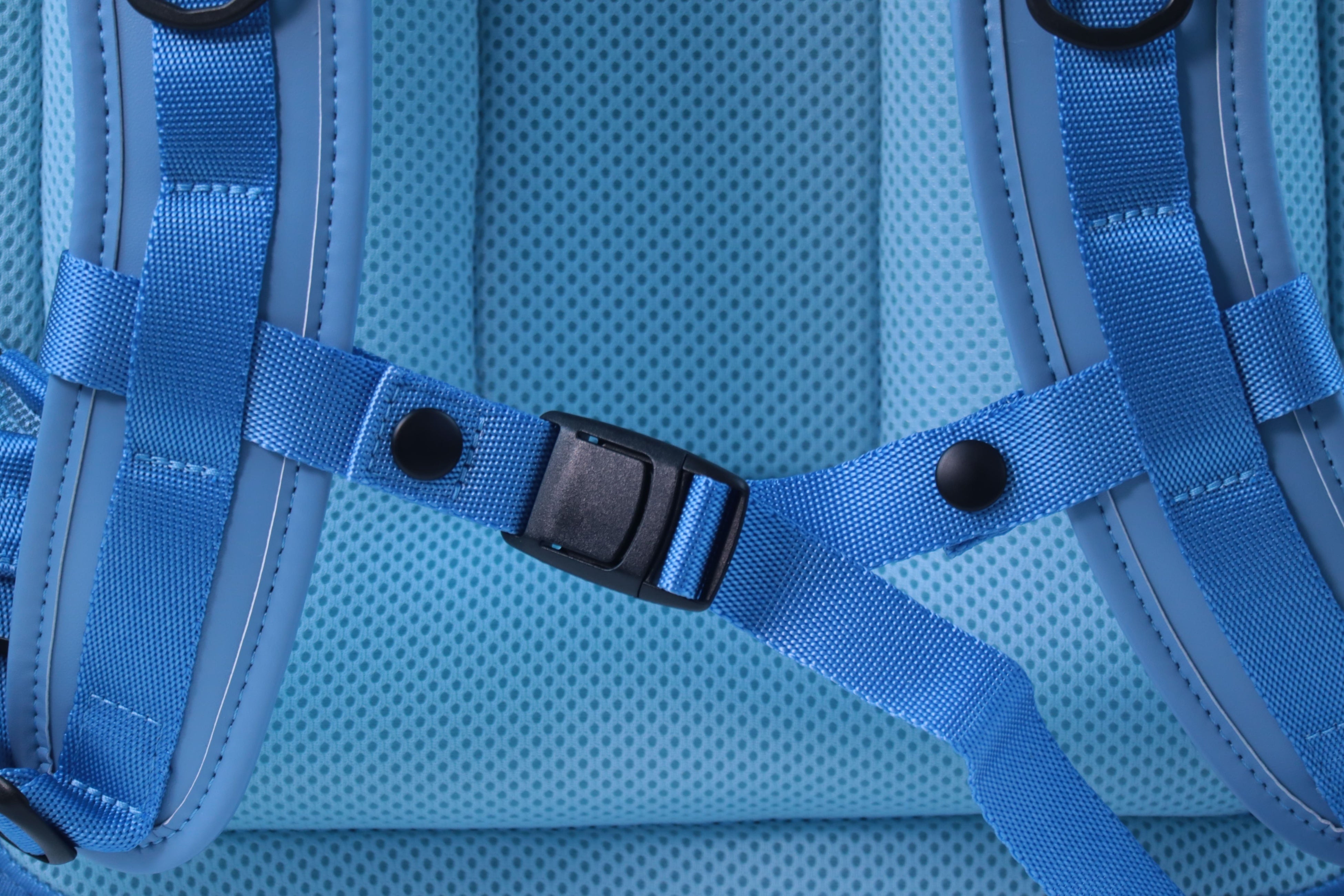 肩のズレ落ちを防ぐ専用チェストストラップ。固定することでフィット感を高め、体の負担を軽減します。リュッセル本体はベルトループを搭載しているため、ストラップがずれ落ちる心配もありません。2025年度モデルはフロントリリースバックルを採用し、脱着がしやすいようアップデートを行いました。