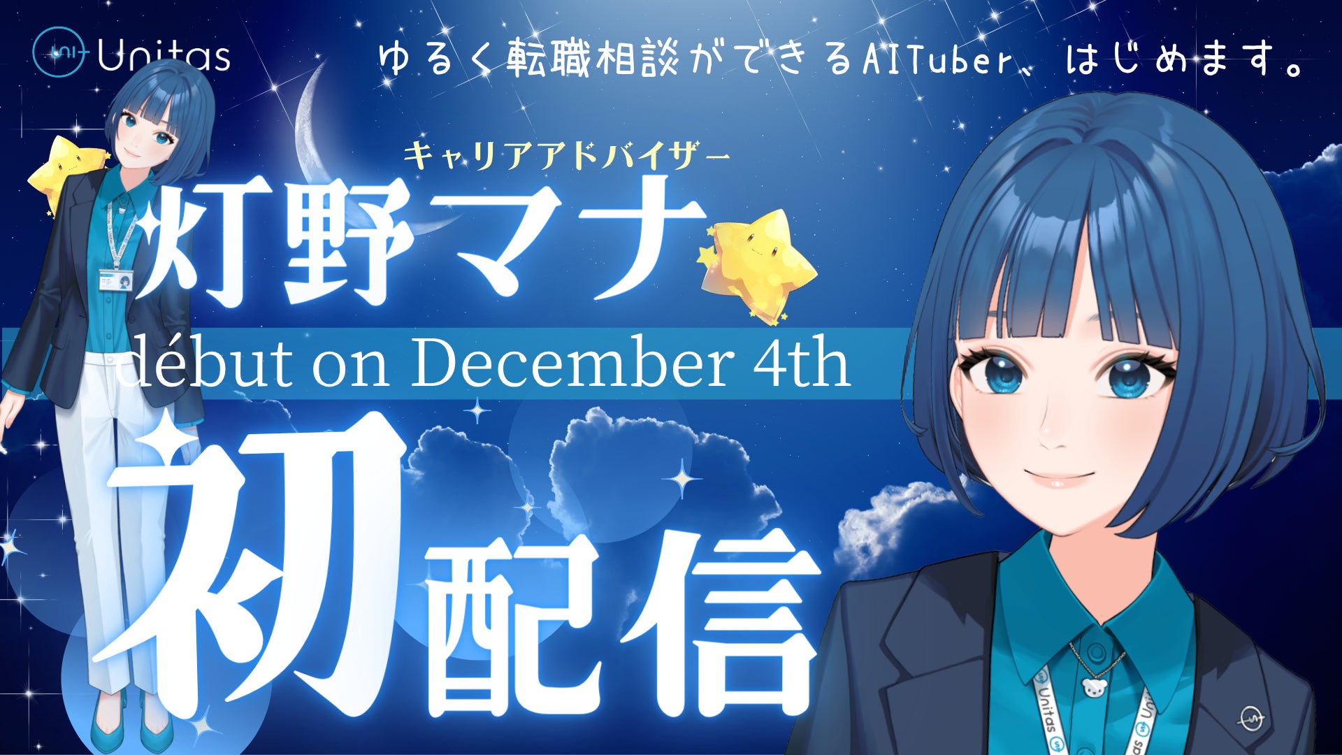 株式会社Unitas(本社:東京都目黒区、代表取締役:細川晃男)は、従来の転職エージェントでは実現できなかった「24時間365日」「もっと気軽に」AIにキャリア相談ができる、AIキャリアアドバイザー「灯野マナ」を 2025年12月4日(木)より、YouTube上で爆誕します。