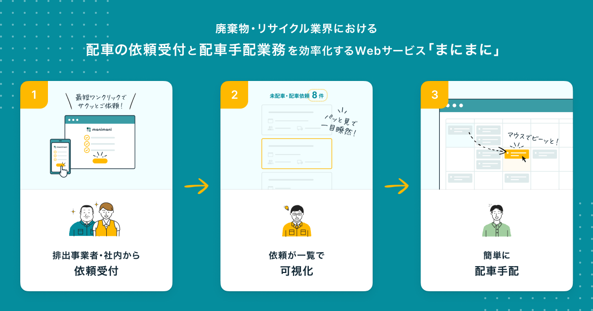 「まにまに」は廃棄物の収集運搬事業者向けに、依頼受付と配車手配を効率的にミスなく業務をできるWebツールです。Web上で一元管理することで、情報の抜け漏れを防ぎ、紙やエクセル、別システムからの転記作業が不要となり、配車担当者の生産性向上をはじめ、車両稼働率や回収効率の向上を実現します。