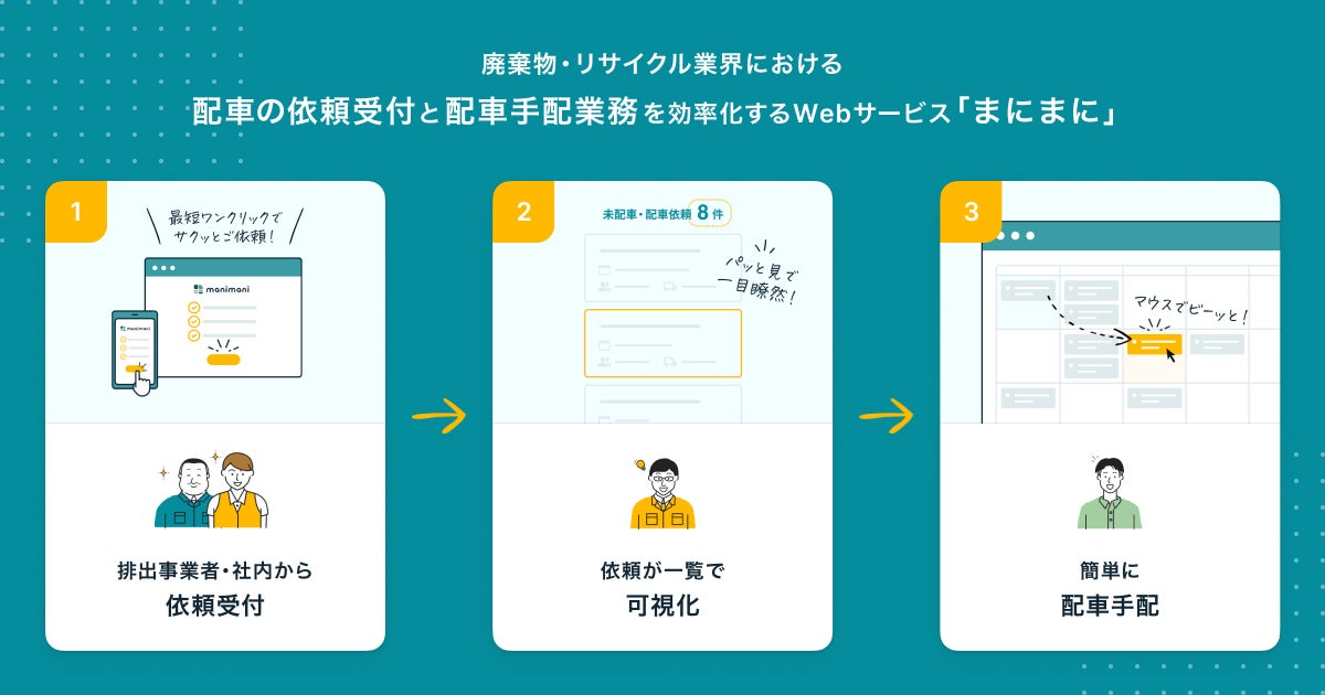 事業内容:廃棄物・リサイクル業界の収集運搬業務の依頼受付や配車手配する上での業務効率化のためのWebツール「まにまに」の開発、運営、販売・DX推進支援