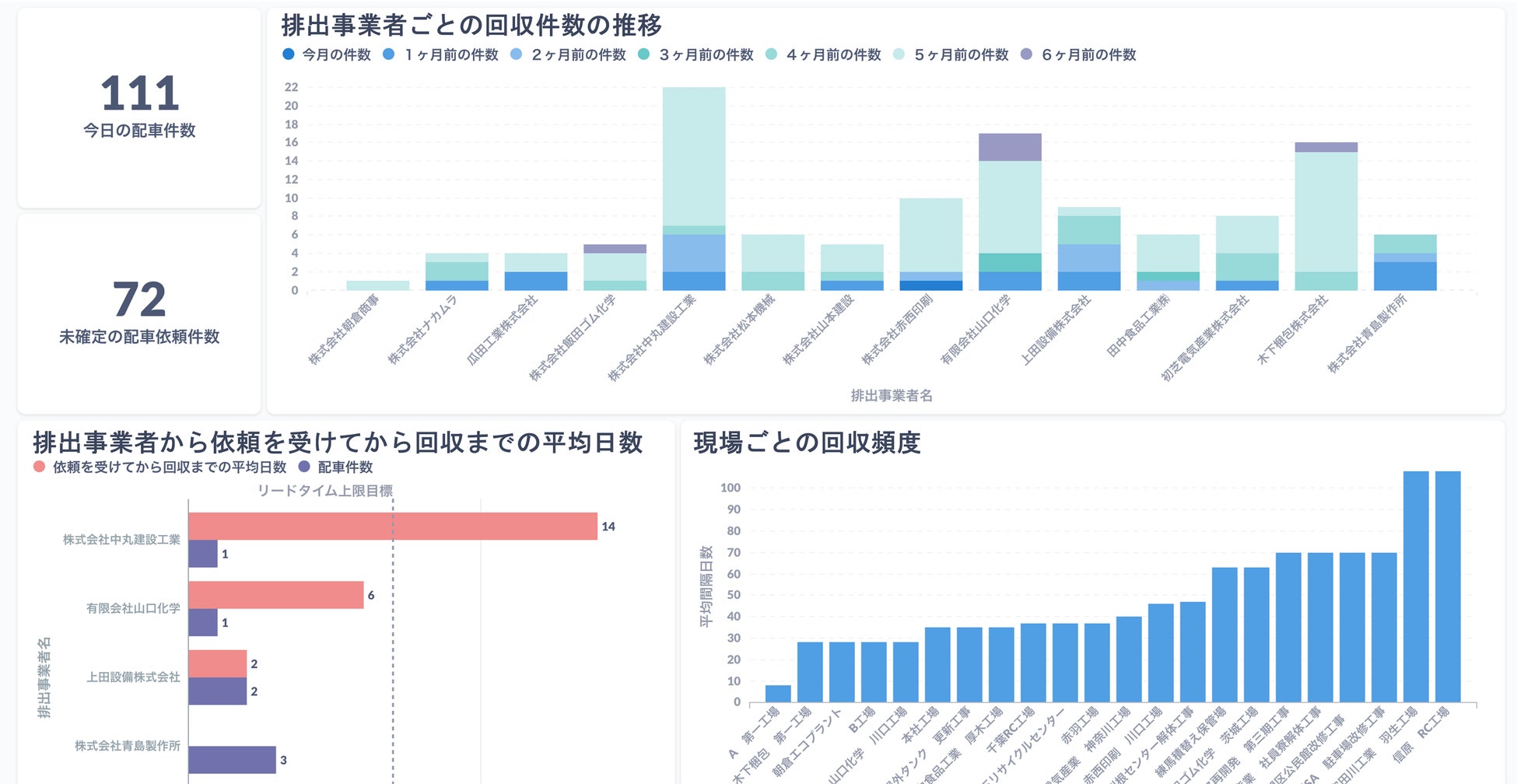 廃棄物・リサイクル業界における収集運搬業者さまの配車管理業務は、紙やエクセル、ホワイトボードの使用が大半を占めており、業務が属人的になる傾向があります。また、営業活動や廃棄物・資源物の回収に関するデータの蓄積がないことや、データを抽出するために多くの時間を要することが、経営課題に挙げられています。そのため、経営において属人的な判断が多くなってしまい、適切な経営戦略が立てづらい状況にあります。