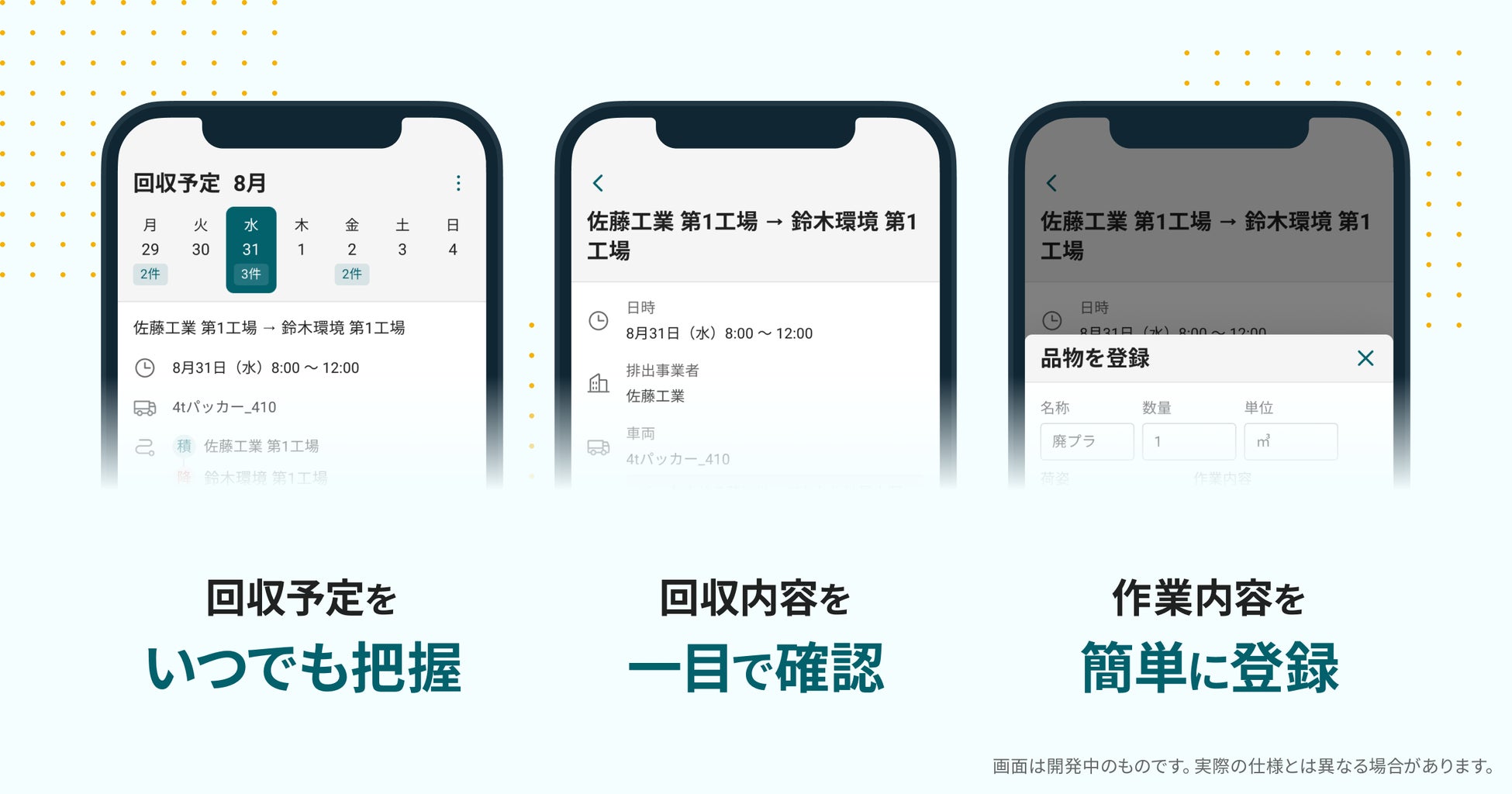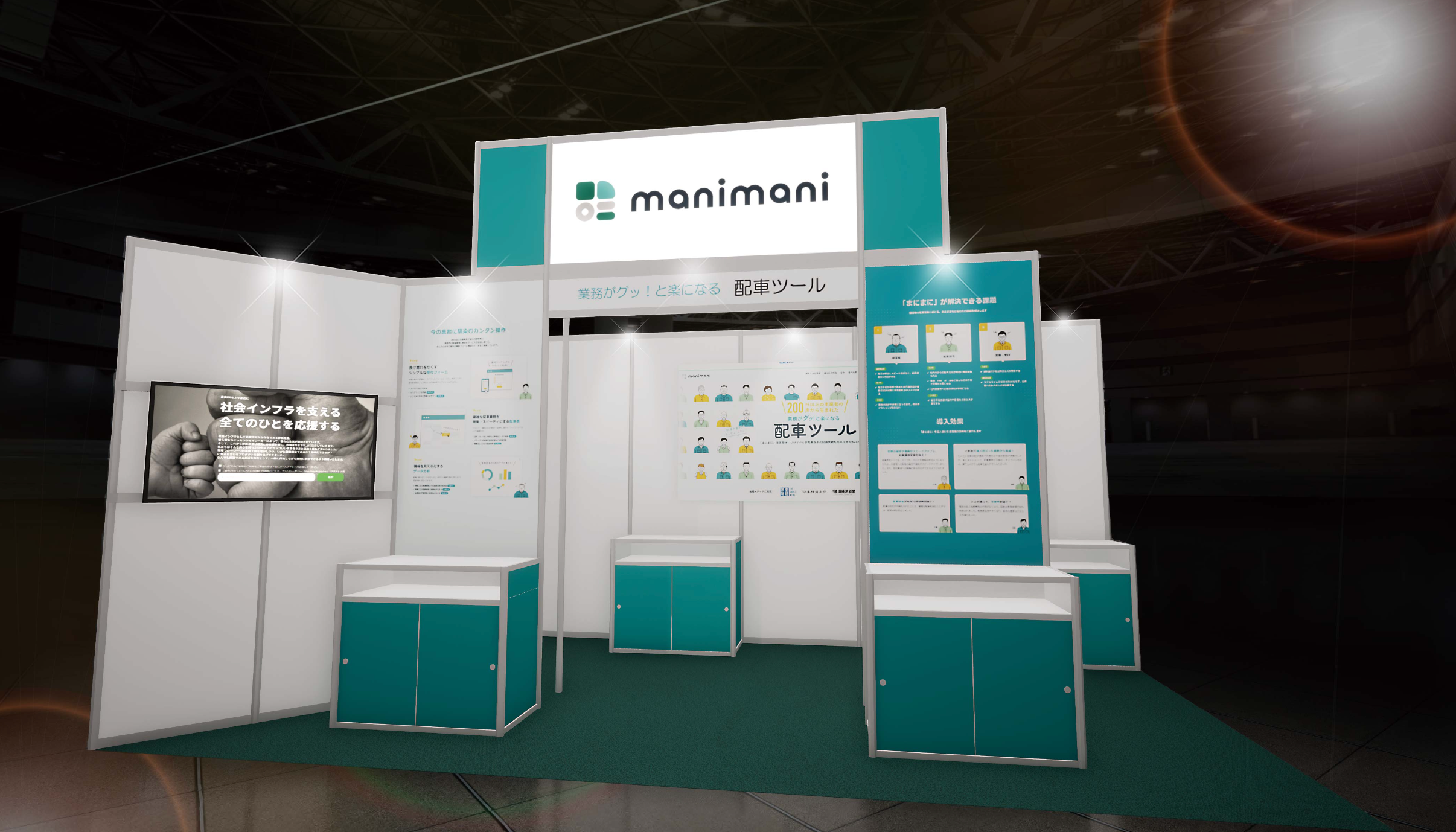 展示内容:廃棄物・リサイクル業界における、収集運搬業務の依頼受付や配車手配の効率化を支援するWebツール「まにまに」および「まにまにデータ分析」、新サービスとして提供予定のスマートフォンに最適化したドライバー向けの画面イメージ