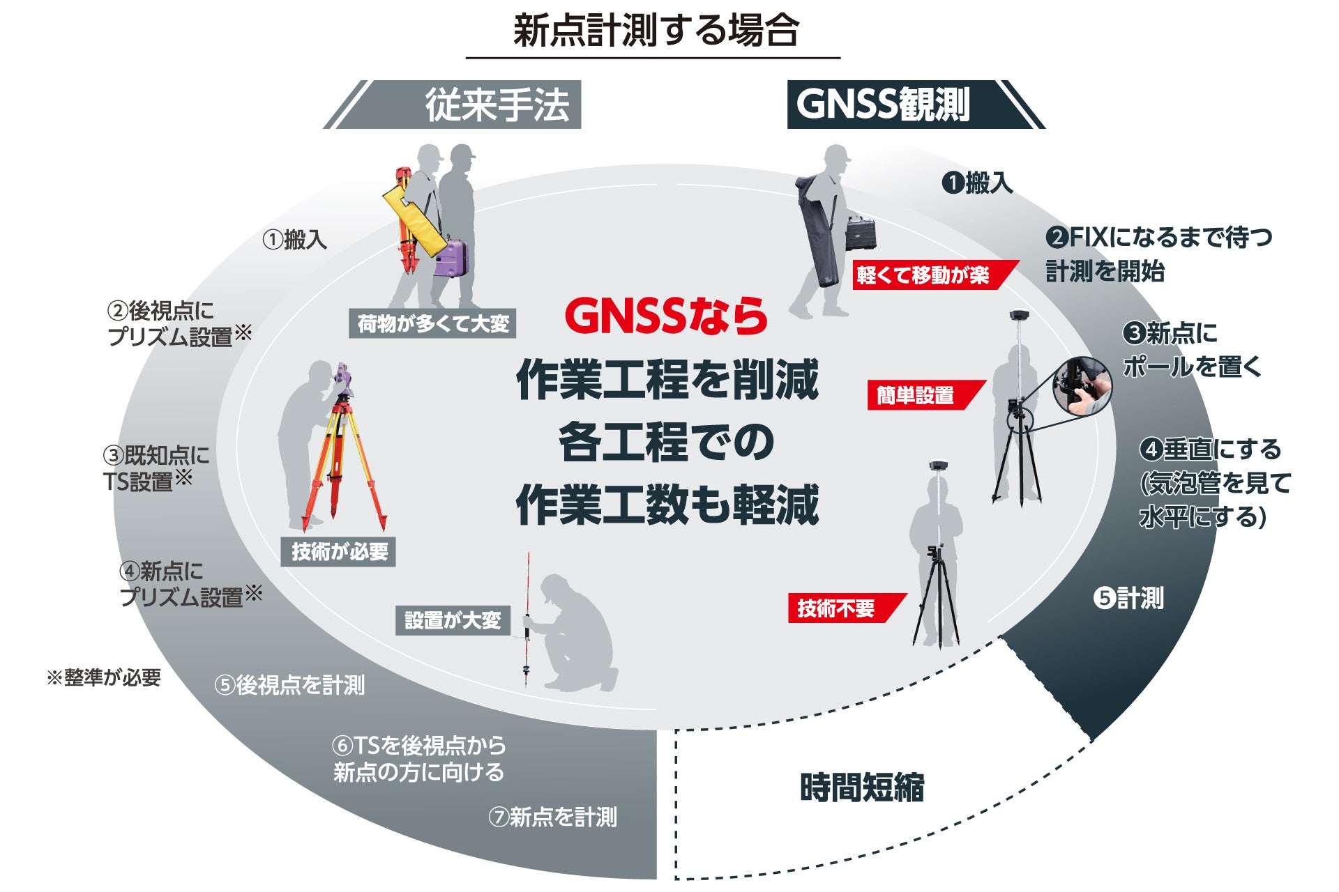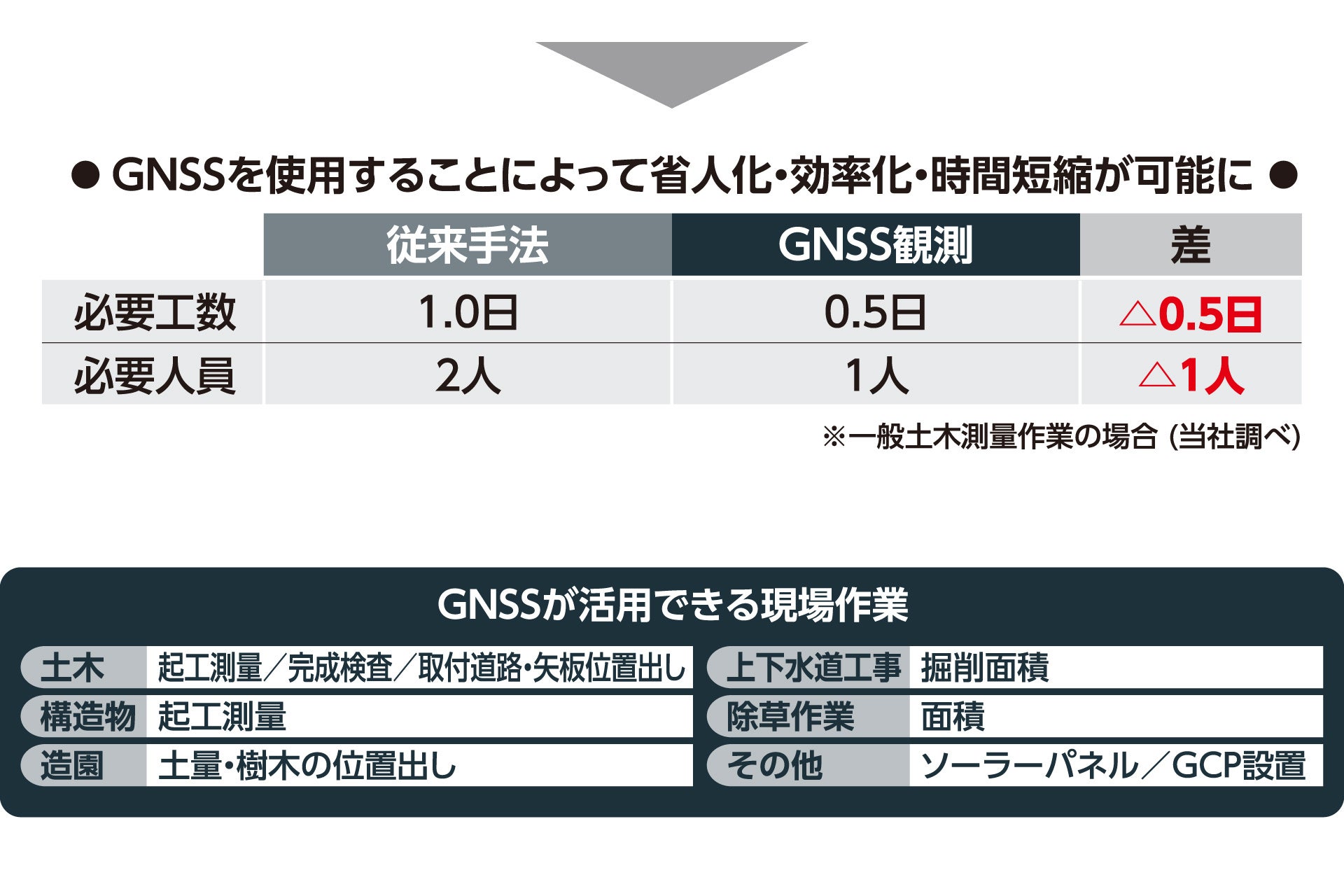 現在、国土交通省をはじめとする各機関が、土木建設現場におけるICT建設機械、ドローン等を活用したICT施工を推進しています。GNSS測量もそのひとつで、、従来手法よりも省人化・効率化・時間短縮を図ることができます。