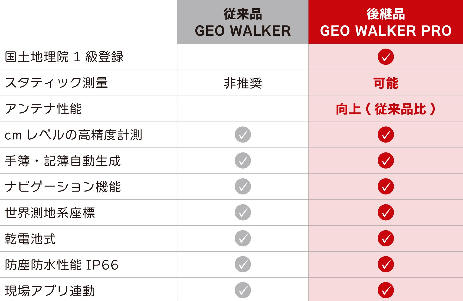 『GEO WALKER PRO』は、従来機『GEO WALKER』の長所である、高いコストパフォーマンスを保ちつつ、さらに国土地理院1級GNSS測量機*として登録された製品です。