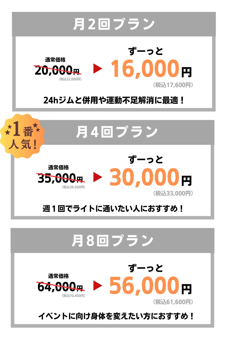 大手のパーソナルジムとは異なり、月額コースやお得な回数券のご用意がございます。