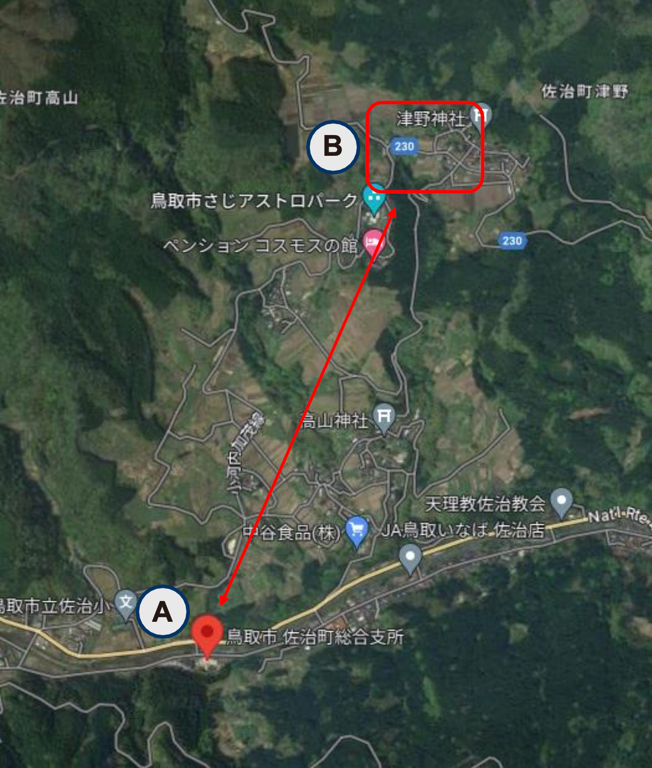 鳥取市佐治総合支所(鳥取市佐治町加瀬木2519−3)~佐治町津野地区公民館(ふれあいの館)(約1.5Km、約5分)