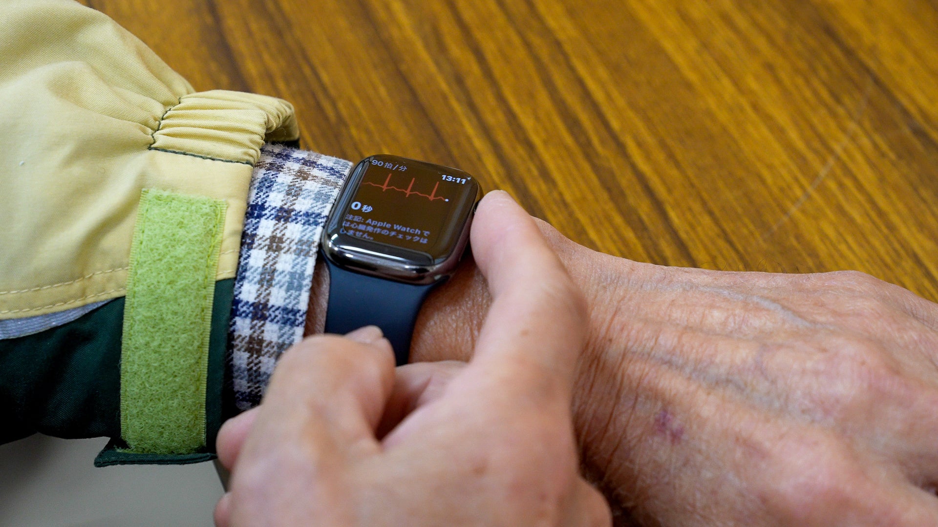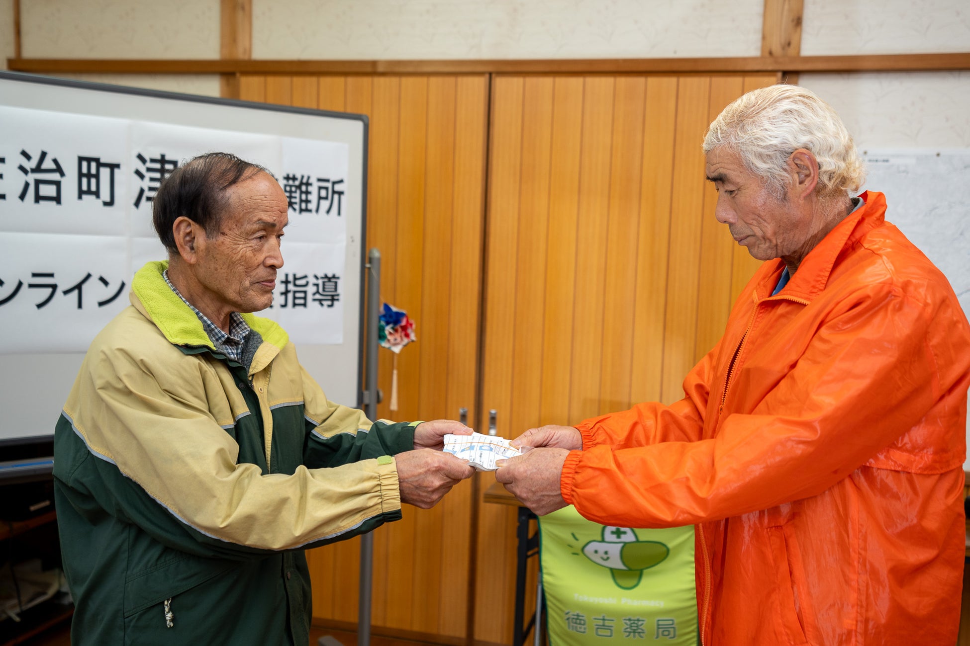 津野地区公民館(ふれあいの館)に着陸したドローンから端末を受け取った住民はウェアラブル端末を手首に装着し、生体データを計測。