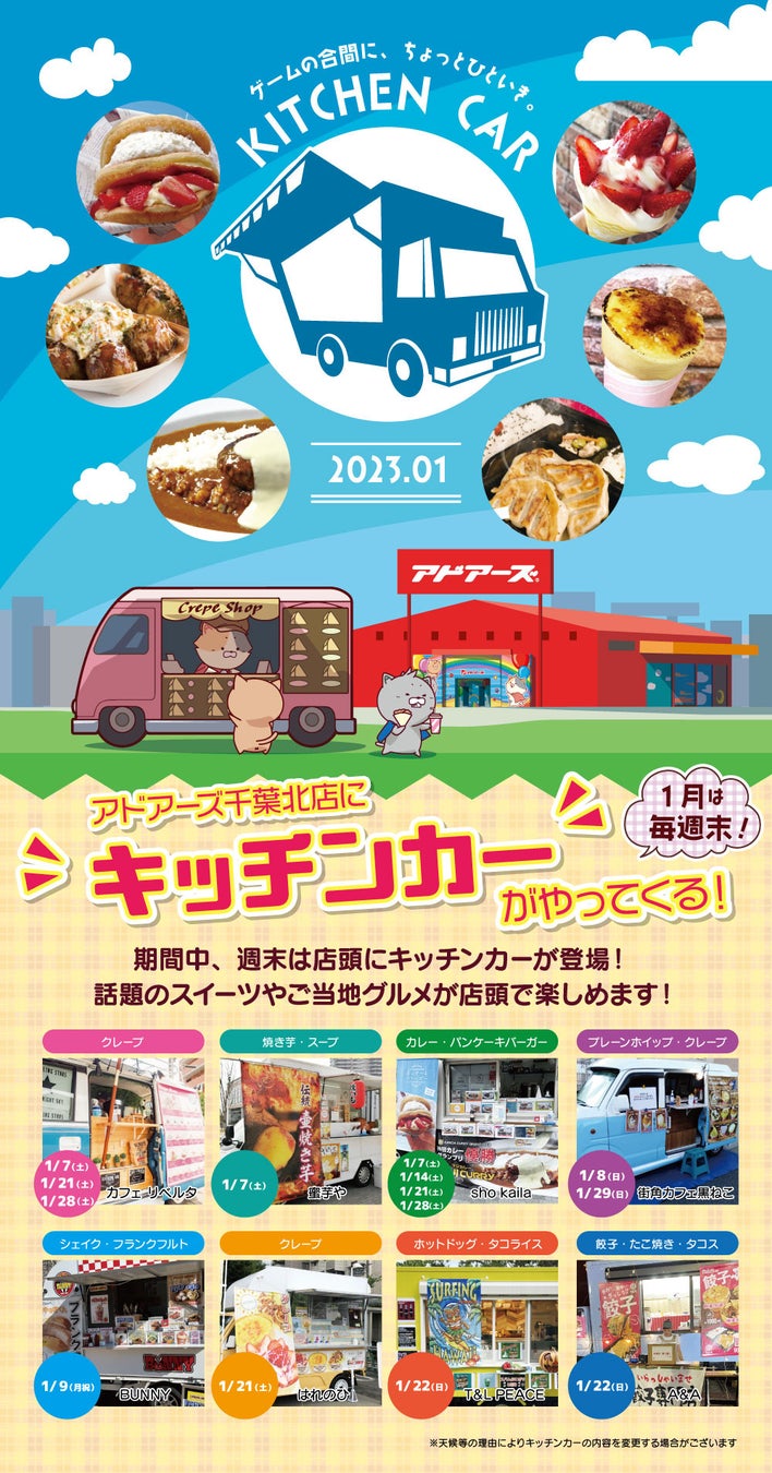 株式会社ワイドレジャー(本社:福岡県小郡市、代表:菊池 太一郎)が運営する、千葉県千葉市内のアミューズメント施設「アドアーズ千葉北店」の店頭に、さまざまなキッチンカーが期間限定で登場いたします。(※2023年1月末まで実施予定)
