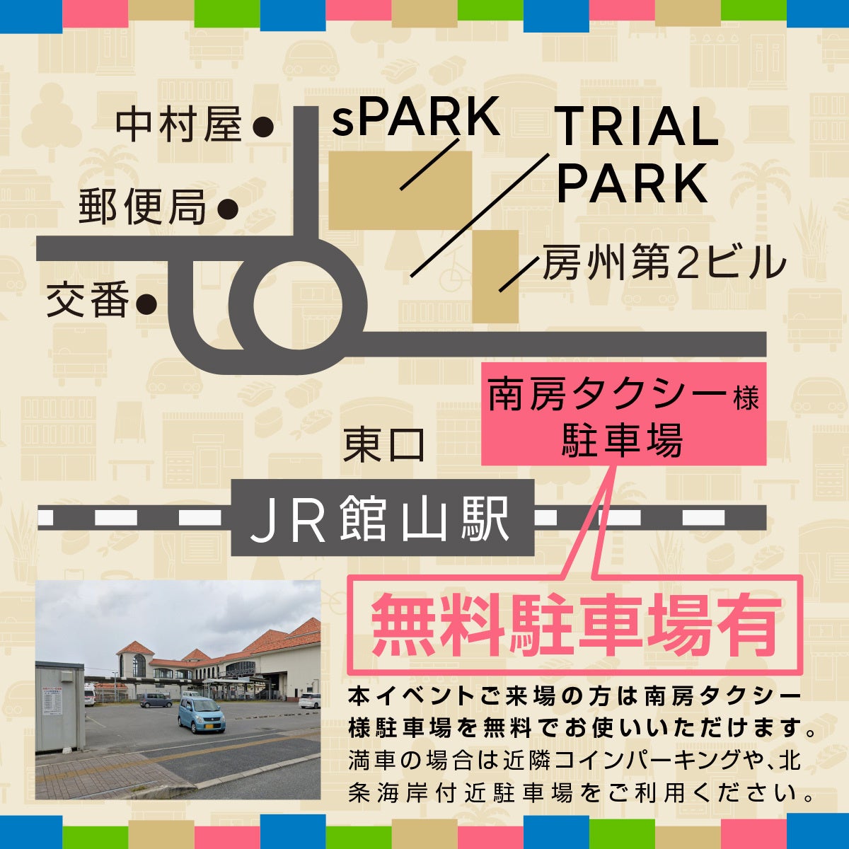 駐車場は館山駅東口すぐにある、南房タクシー駐車場です。普段は有料ですが、当日のみ特別無料となります。
