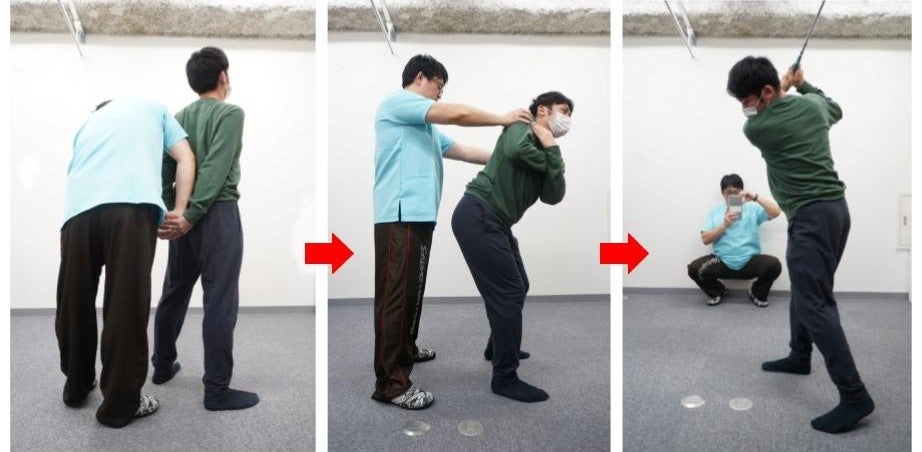 回旋動作の可動域検査を行います。スウィングの妨げになっている筋肉がリセットされたか確認します。
