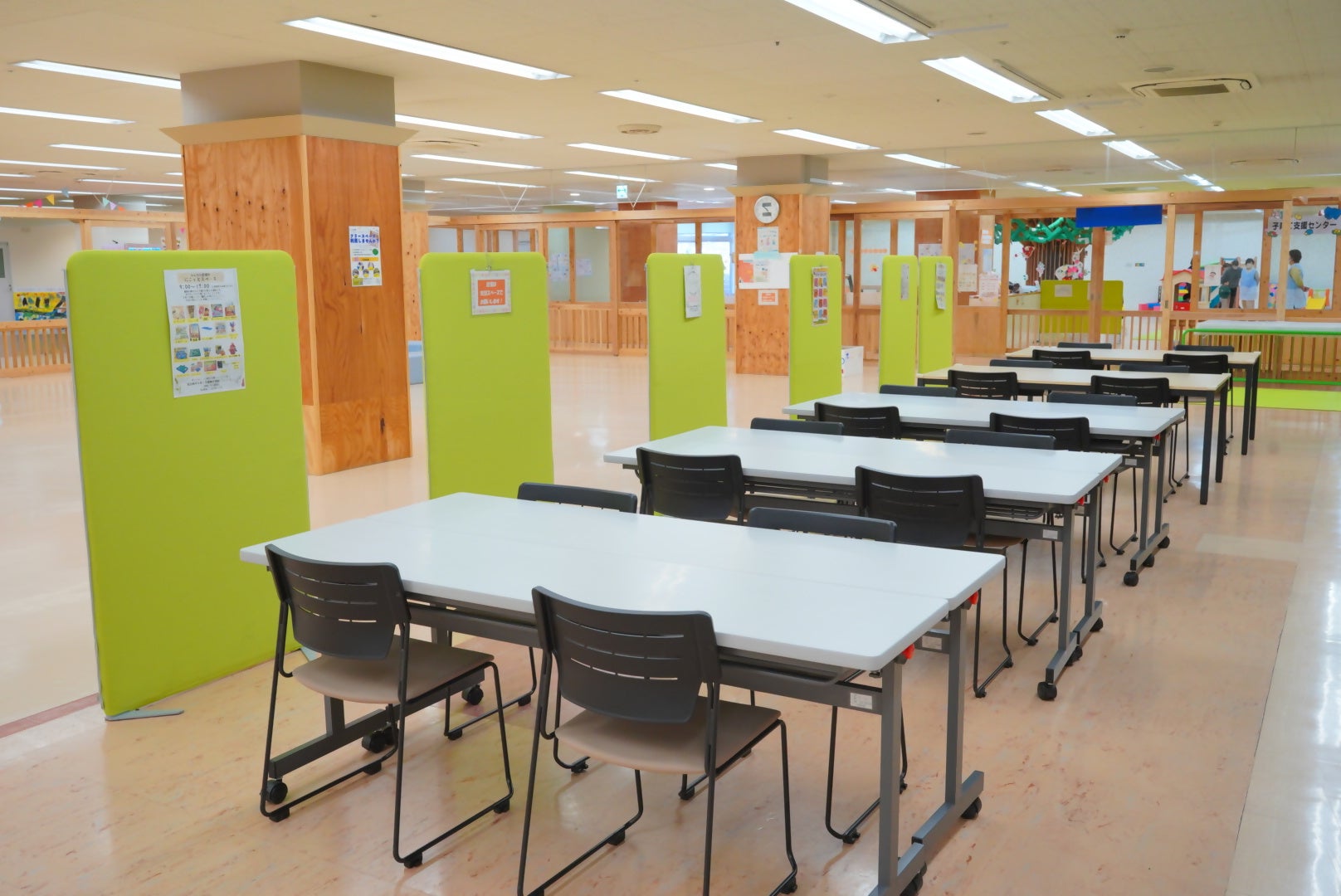 「にこっと」の中心にあるフリースペースの一部を、小中学生の居場所として開放しています。勉強やゲームなど、子どもたちが自由に過ごせる場所であり、卓球などの設備もあります。