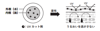 UVカット剤や粉体をエマルジョンの内層に配合。そのまわりを美容液ジェルが覆っているので、肌にのせた瞬間みずみずしさが弾けます。まるで肌がヴェールを纏うように、美容液ジェルが薄く広がり包み込みます。肌のうるおいを閉じ込めて逃がさない力と、SPF50+、PA++++の高い紫外線カットのダブルバリア効果を叶えました。