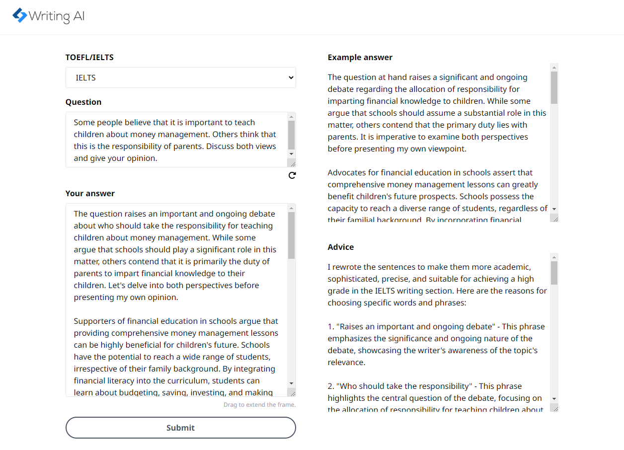 GPT3.5を採用し、TOEFL/IELTSのライティング問題を自動的に添削、アドバイスを提供します。ユーザーが自力でより良い文章を作成できるようにサポートします。