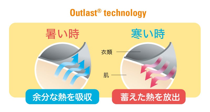 アウトラスト®テクノロジーは、体まわりの温度を整える素材。暑い時には、体温が上がり過ぎないよう熱を吸収し、寒い時には、蓄えた熱を放出して体に戻す。外気温や、冷暖房の気温差に左右されないよう、季節を問わず一日中、体まわりの温度を一定に保つことで、あなたの体を整え、守ります。