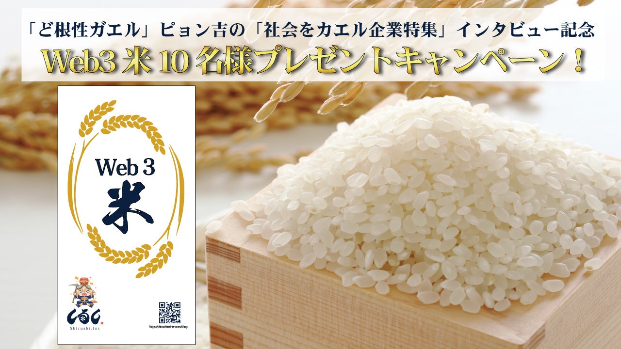 「ピョン吉」とのコラボを記念して当社オリジナルの「WEB3米(ウェブスリーマイ)」が抽選で10名様に当たるキャンペーンを下記の要領で実施します。